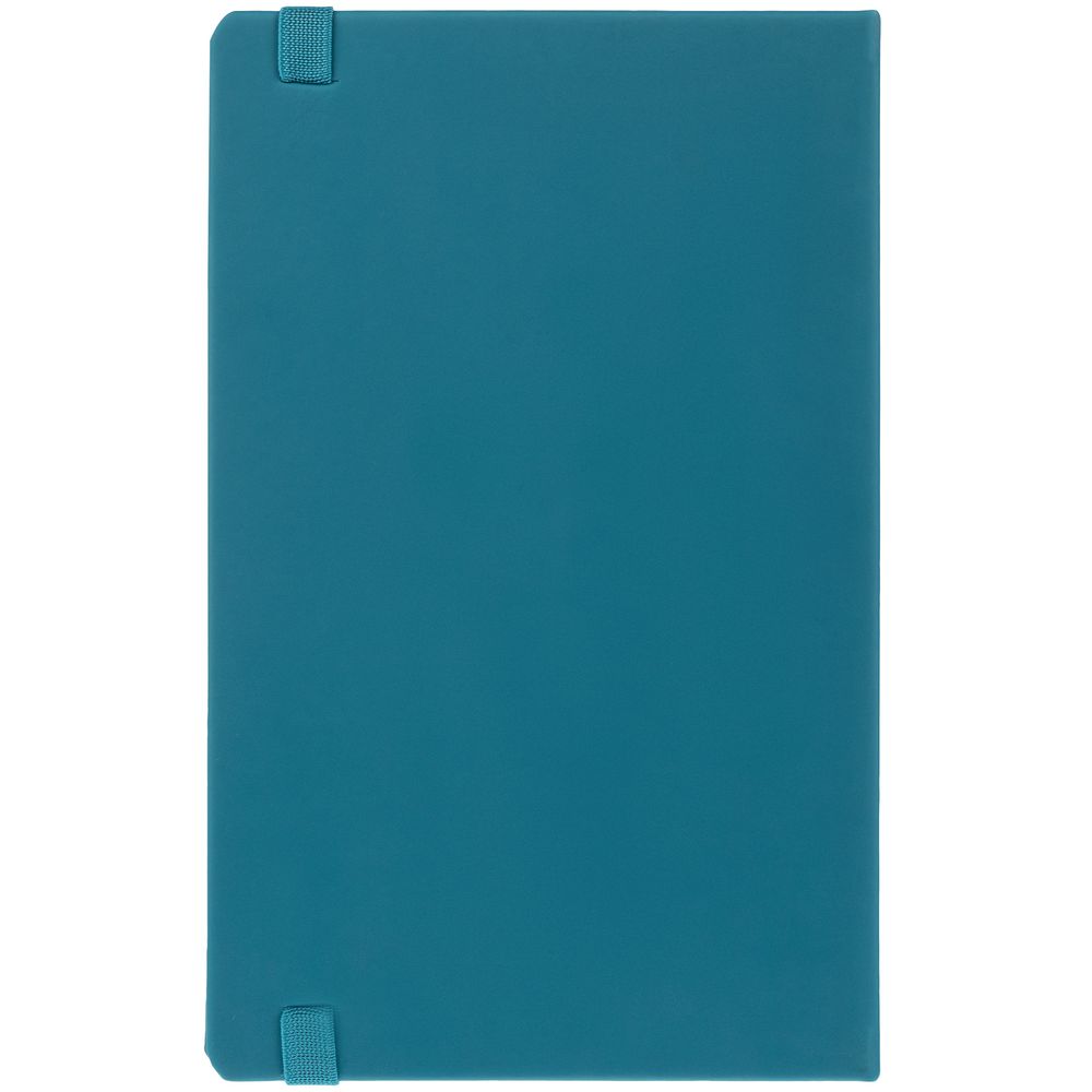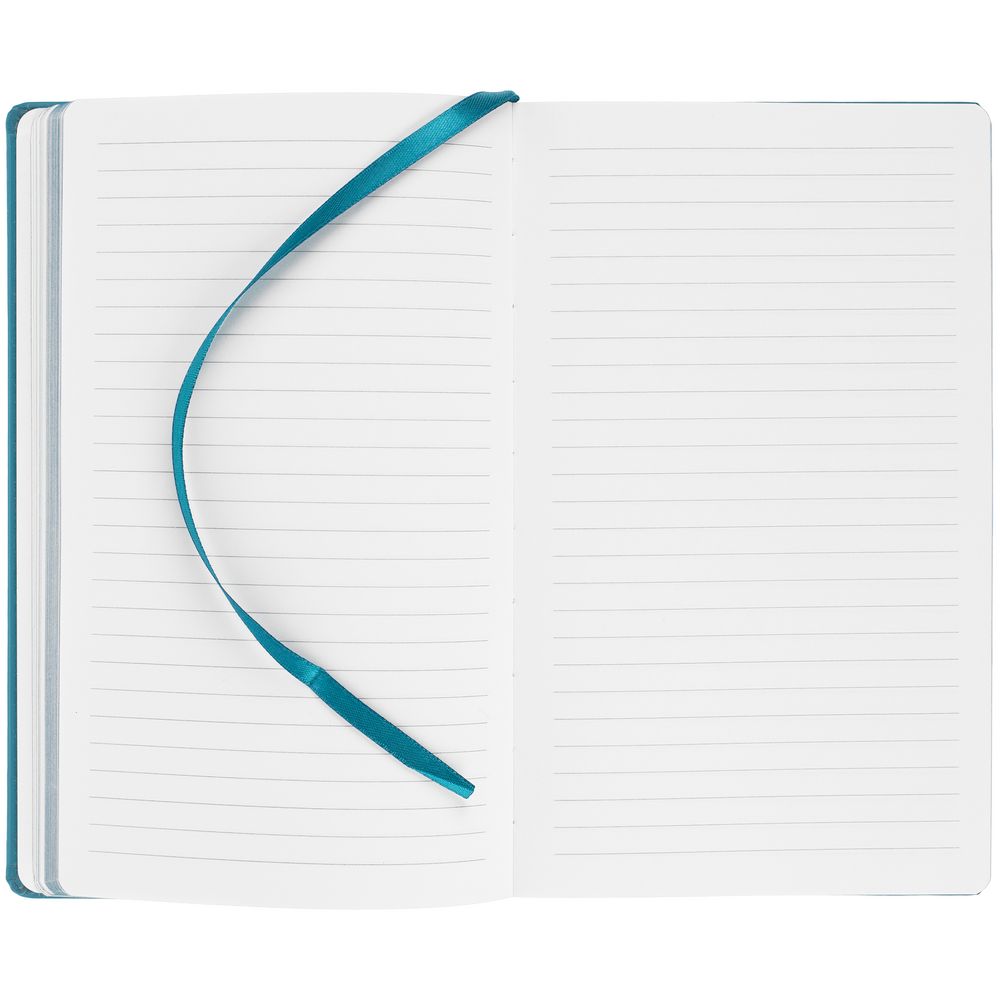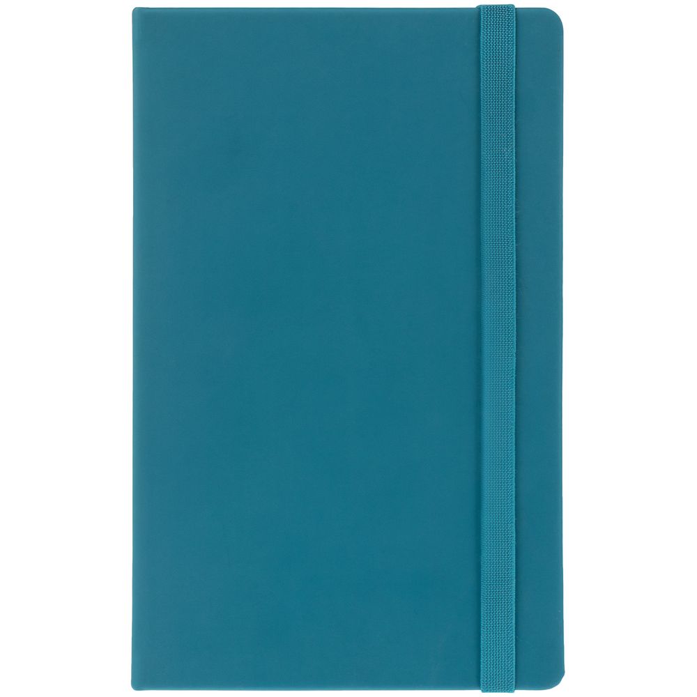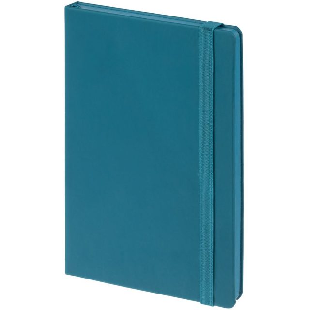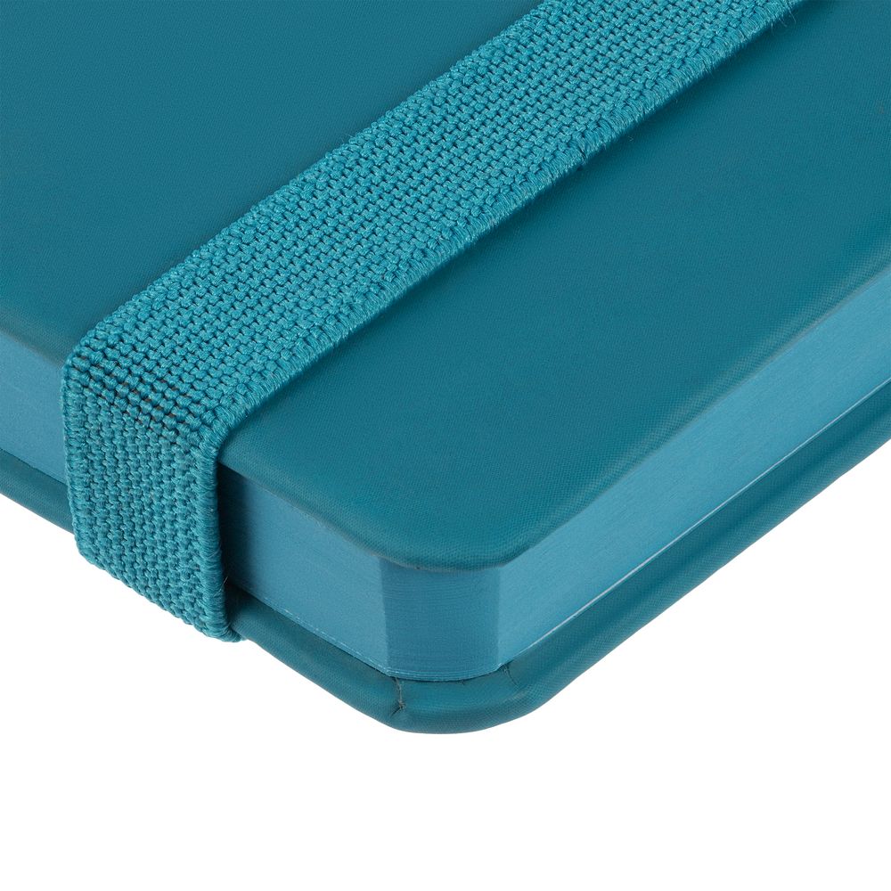 Блокнот в твердой обложке, выполнен из материала Soft Touch, цвет морской волны, дополнен резинкой и ляссе.