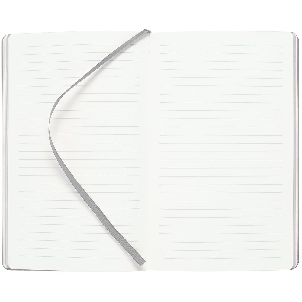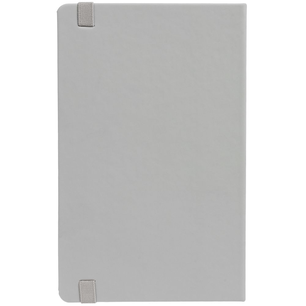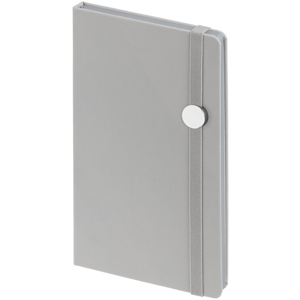 Блокнот в твердой обложке, выполнен из материала Soft Touch, серый СС, дополнен резинкой и ляссе в цвет обложки.