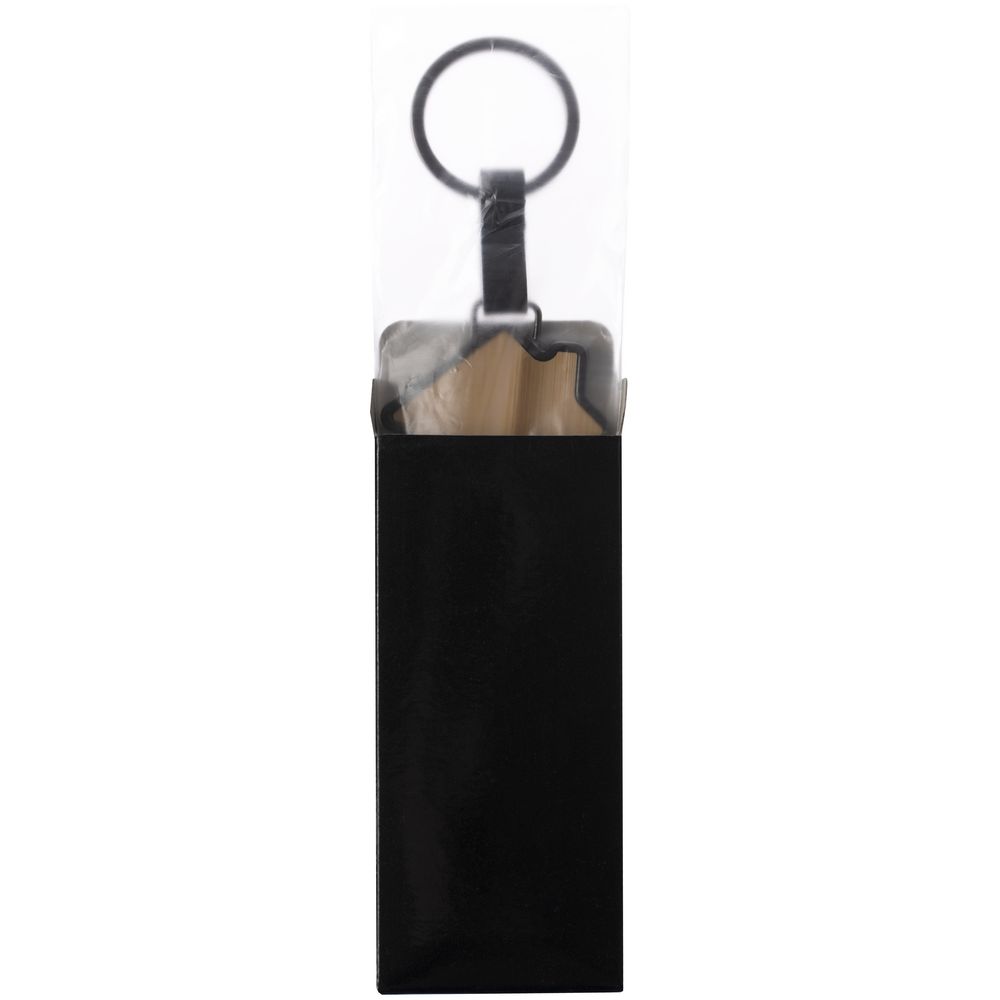 Металлический брелок со вставкой из бамбука и петлей из искусственной кожи. Подойдет для клиентов, отдающих предпочтение качественным натуральным материалам.