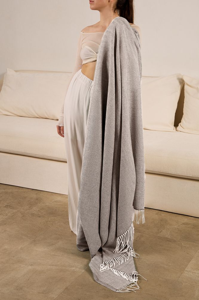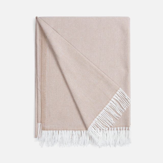 Классический рисунок «елочка» не слишком привлекает внимание, но в то же время добавляет изюминки. Смешанный состав пряжи продлевает срок службы и существенно облегчает уход за пледом.