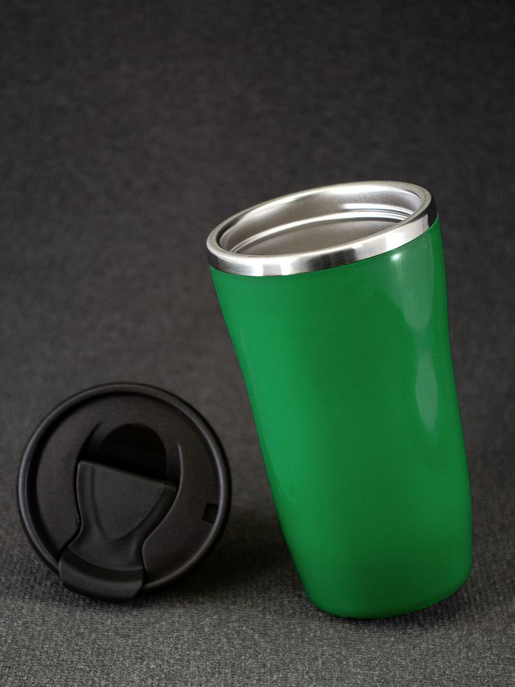 Двухслойная конструкция из пластика снаружи и пищевой нержавеющей стали внутри. Герметичная завинчивающаяся крышка с откидным клапаном для питья. В отверстие в крышке можно вставить шнурок для удобного ношения стакана на руке. Шнурок в комплект не входит.