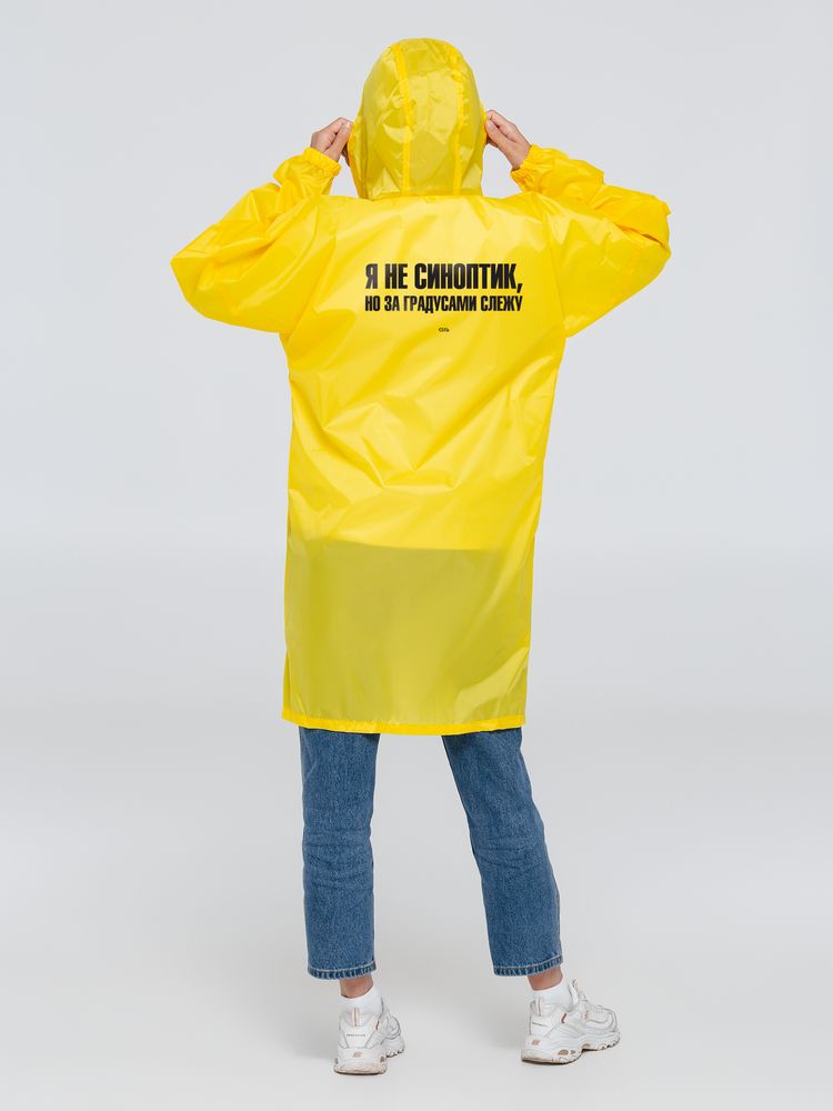Предсказывать погоду трудно. А непогоду — легко! Если на улице тучи, дождь и ветер — это явный признак того, что надо захватить с собой дождевик. И лучше желтый. Вдруг это вызовет солнце!Плащ-дождевик из ткани таффета на молнии с капюшоном. Складывается в мешочек — удобно брать с собой.