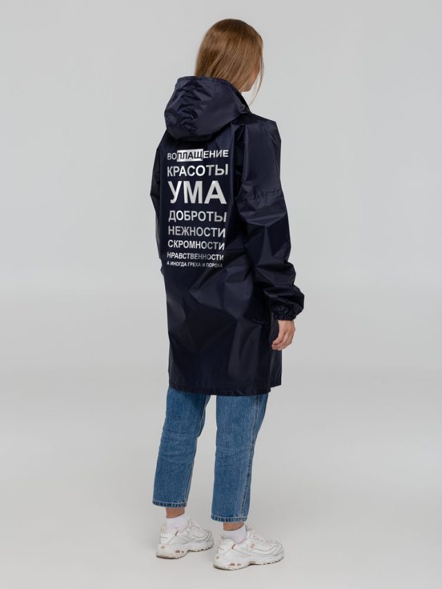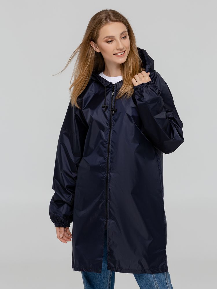 Плащ-дождевик из ткани таффета на молнии с капюшоном. Складывается в мешочек — удобно брать с собой.