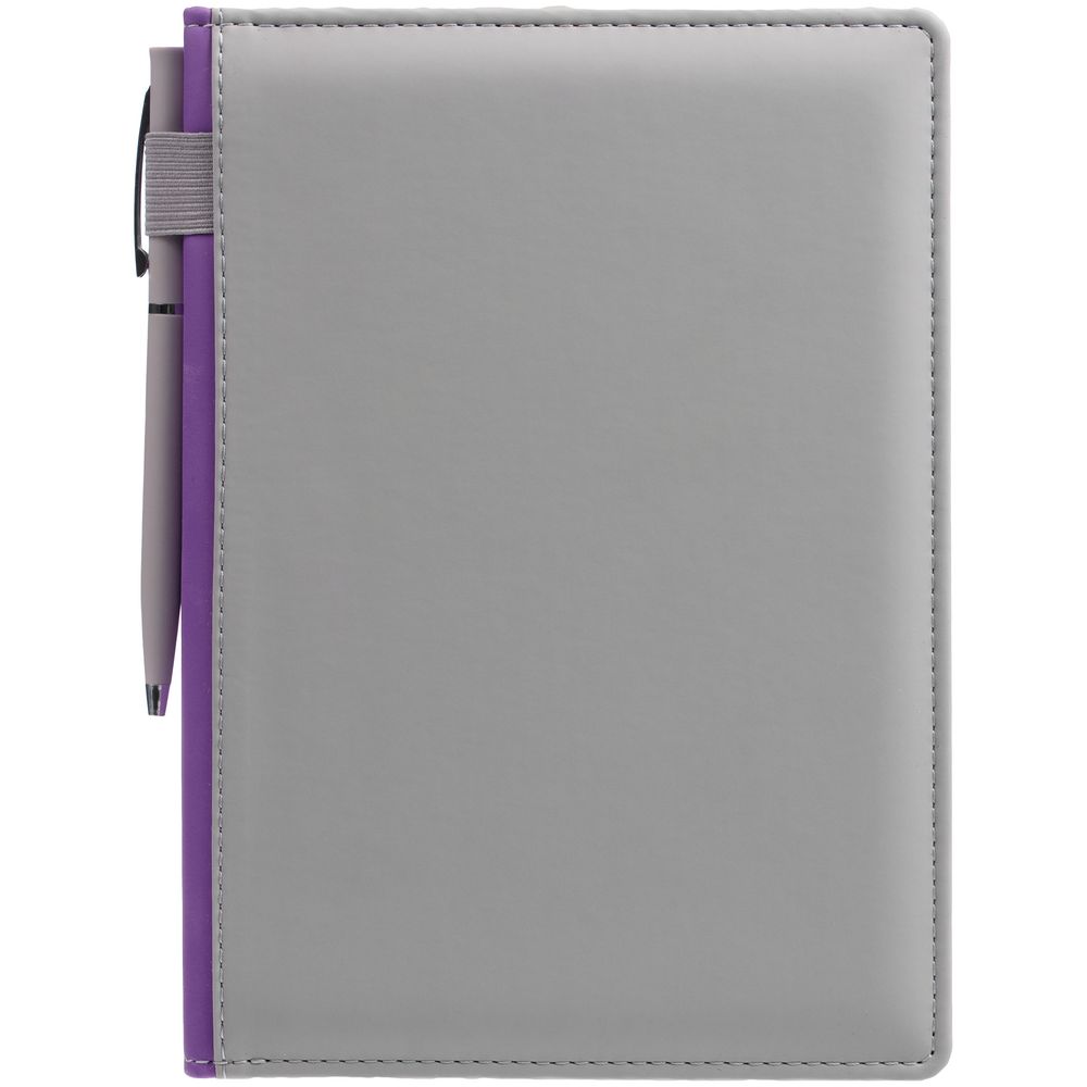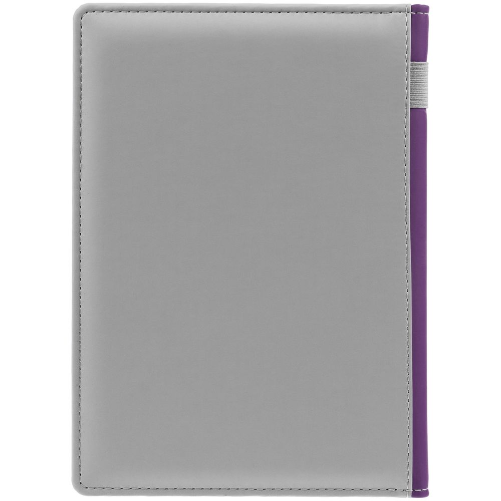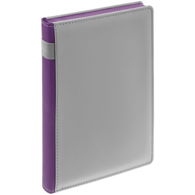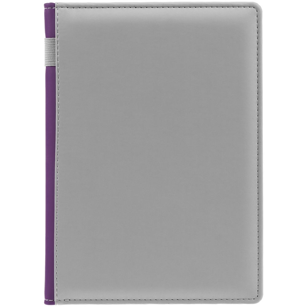 Твердая обложка с поролоном, материал обложки — Soft Touch, серый СС и Soft Touch, фиолетовый UU. На корешке ежедневника находится петля из резинки.