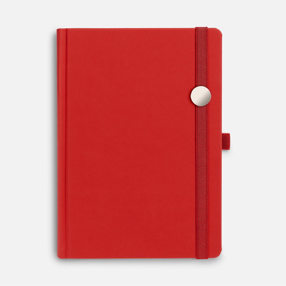 Ежедневник с твердой обложкой без поролона, выполнен из материала Soft Touch Ultra, красный РР, дополнен резинкой шириной 1 см, петлей-резинкой для ручки, капталом и ляссе красного цвета.