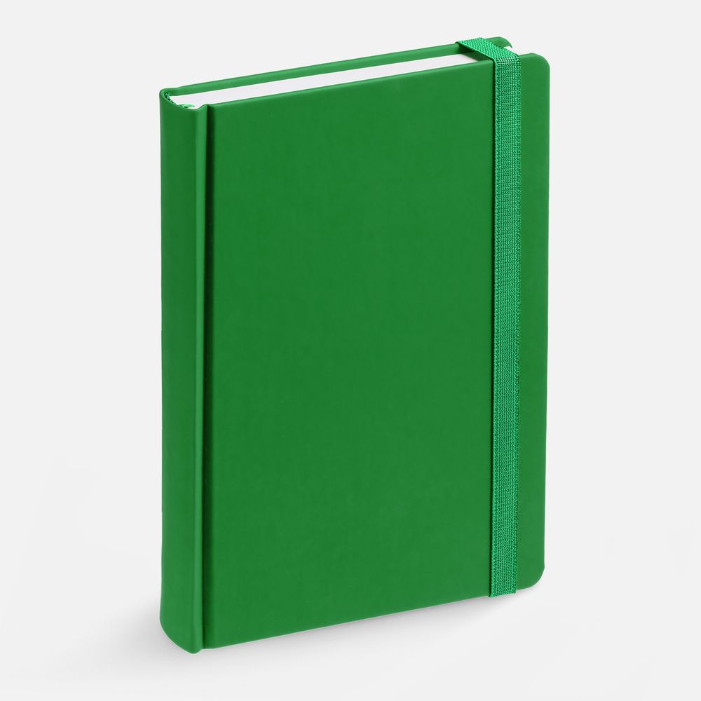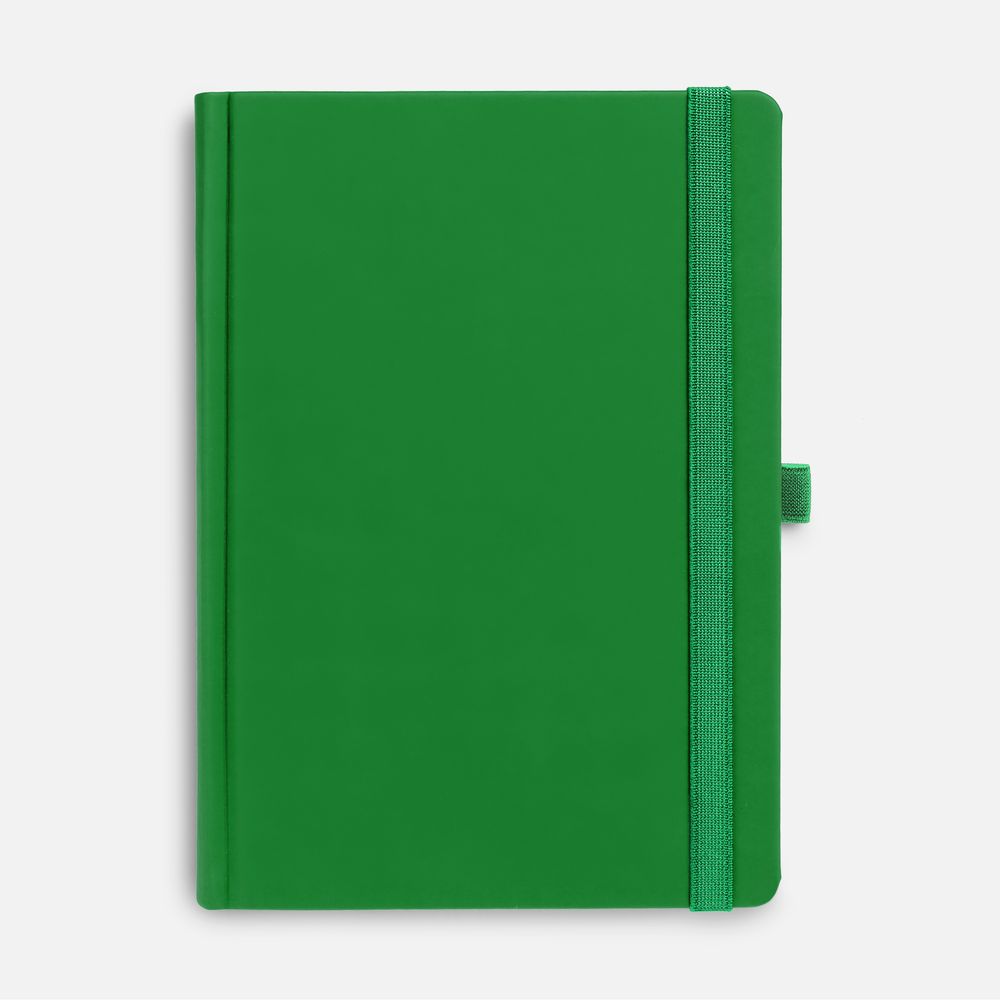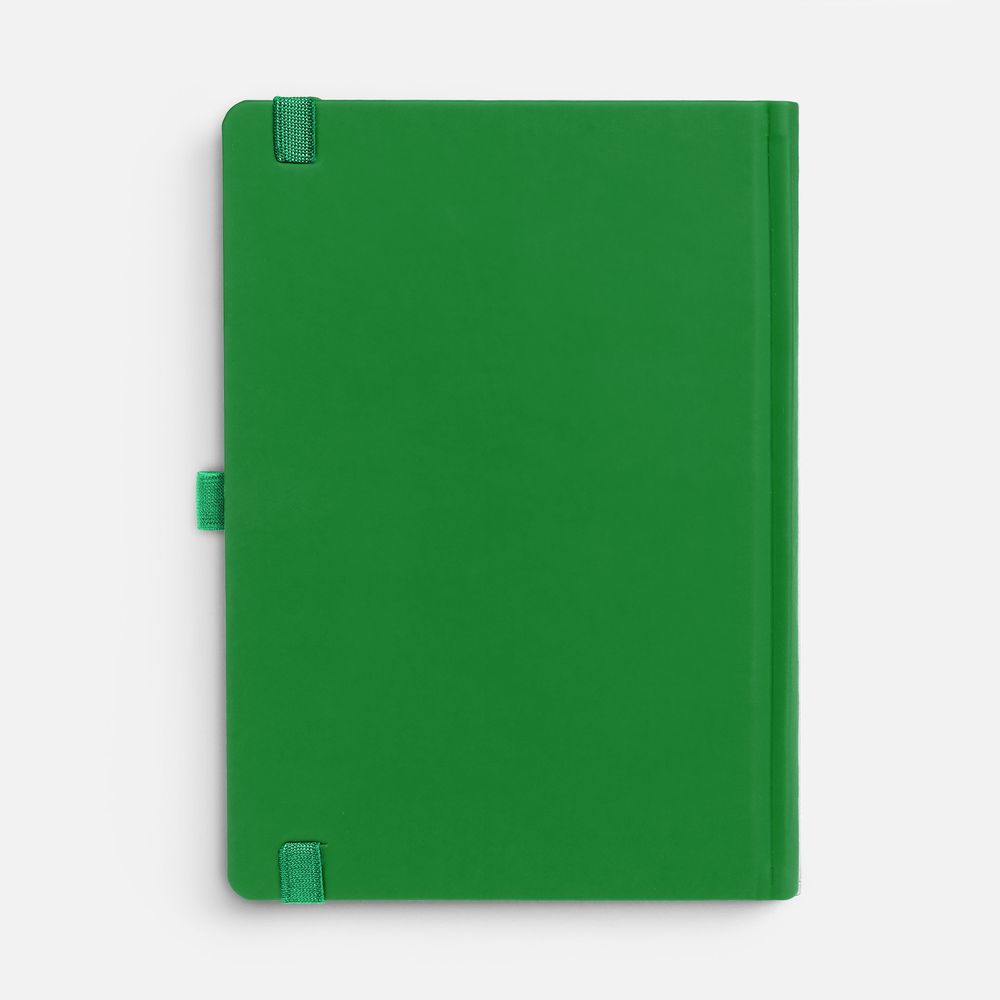 Ежедневник с твердой обложкой без поролона, выполнен из материала Soft Touch Ultra, зеленый FF, дополнен резинкой шириной 1 см, петлей-резинкой для ручки, капталом и ляссе ярко-зеленого цвета.