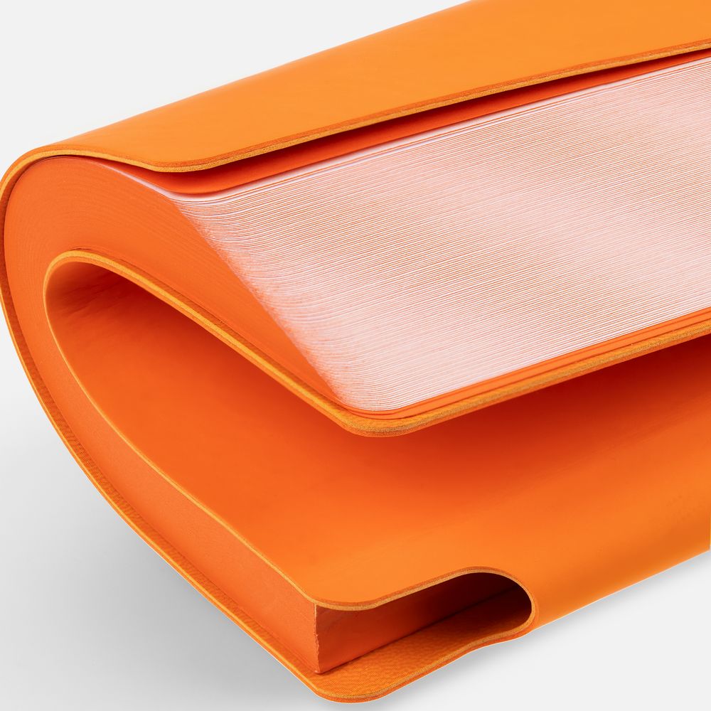 Гибкая обложка выполнена из материала Soft Touch, оранжевый OO и Latte, оранжевый OO (внутренняя часть обложки). Внутри корешка — специальное место для крепления ручки размером до 15х1 см.