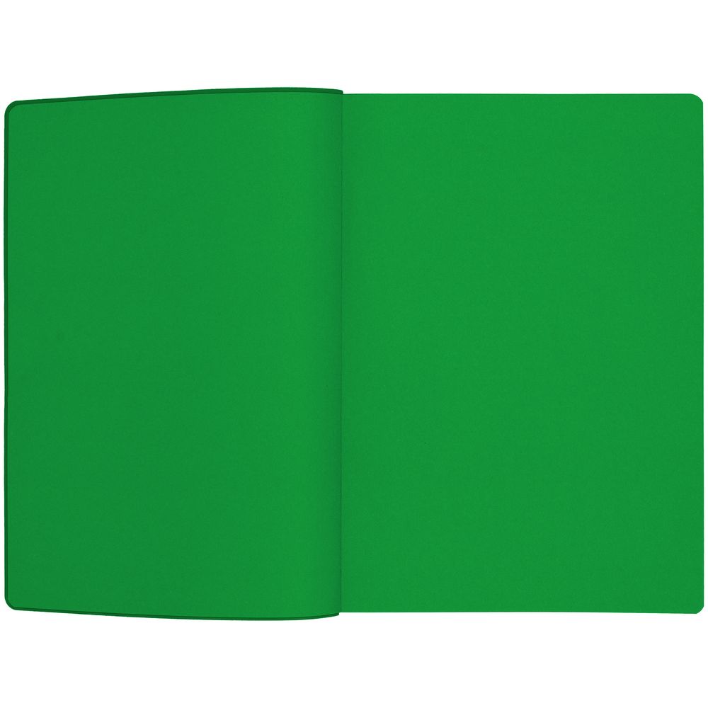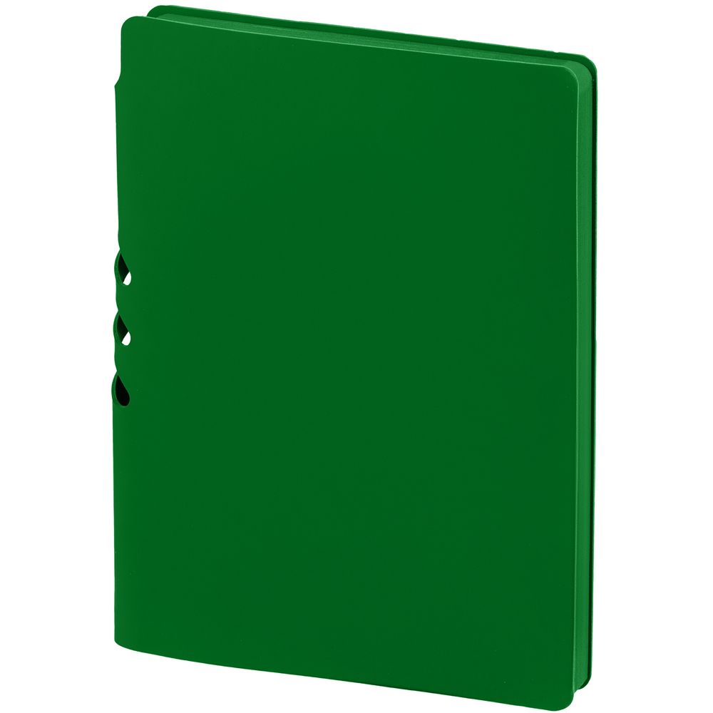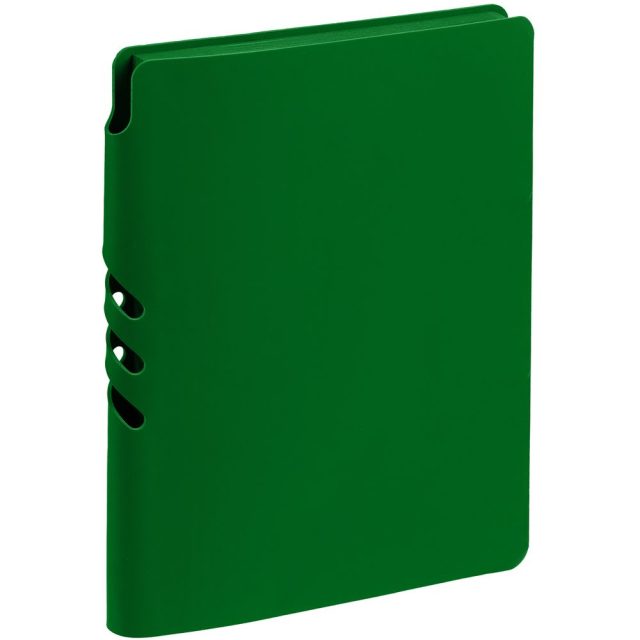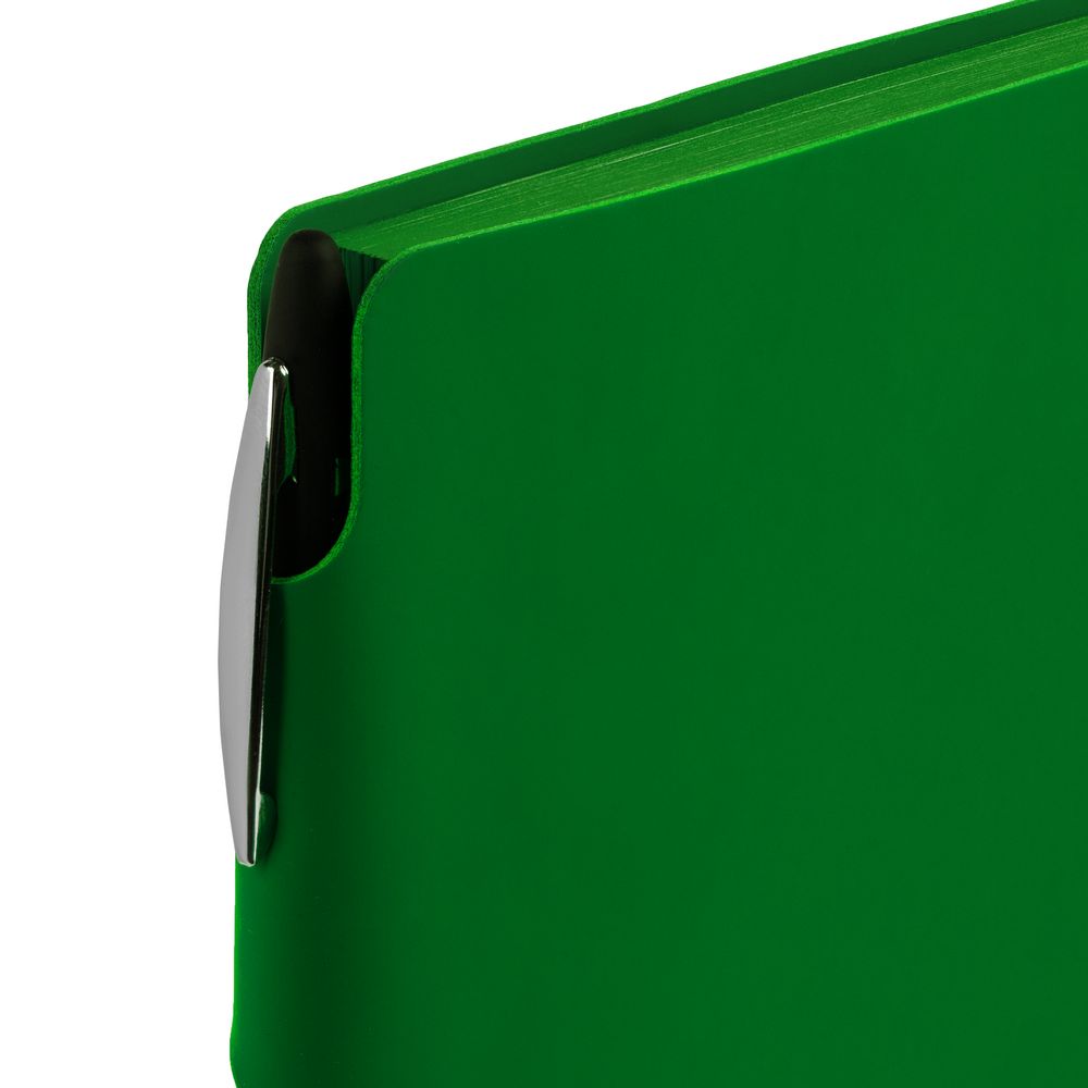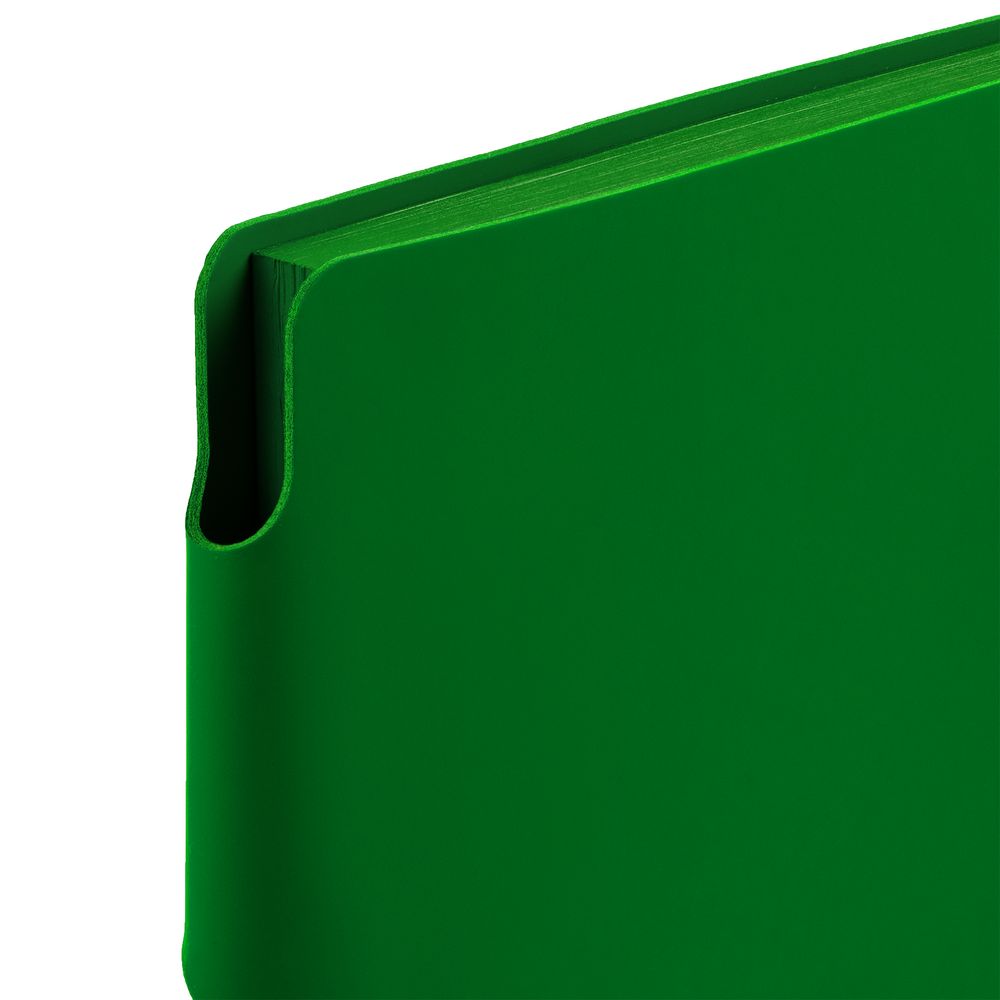 Гибкая обложка выполнена из материала Soft Touch Ultra, зеленый FF. Внутри корешка — специальное место для крепления ручки размером до 15х0,9 см.