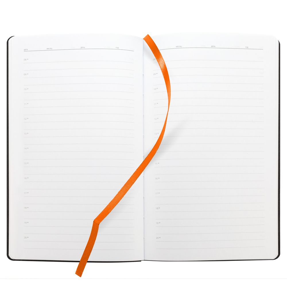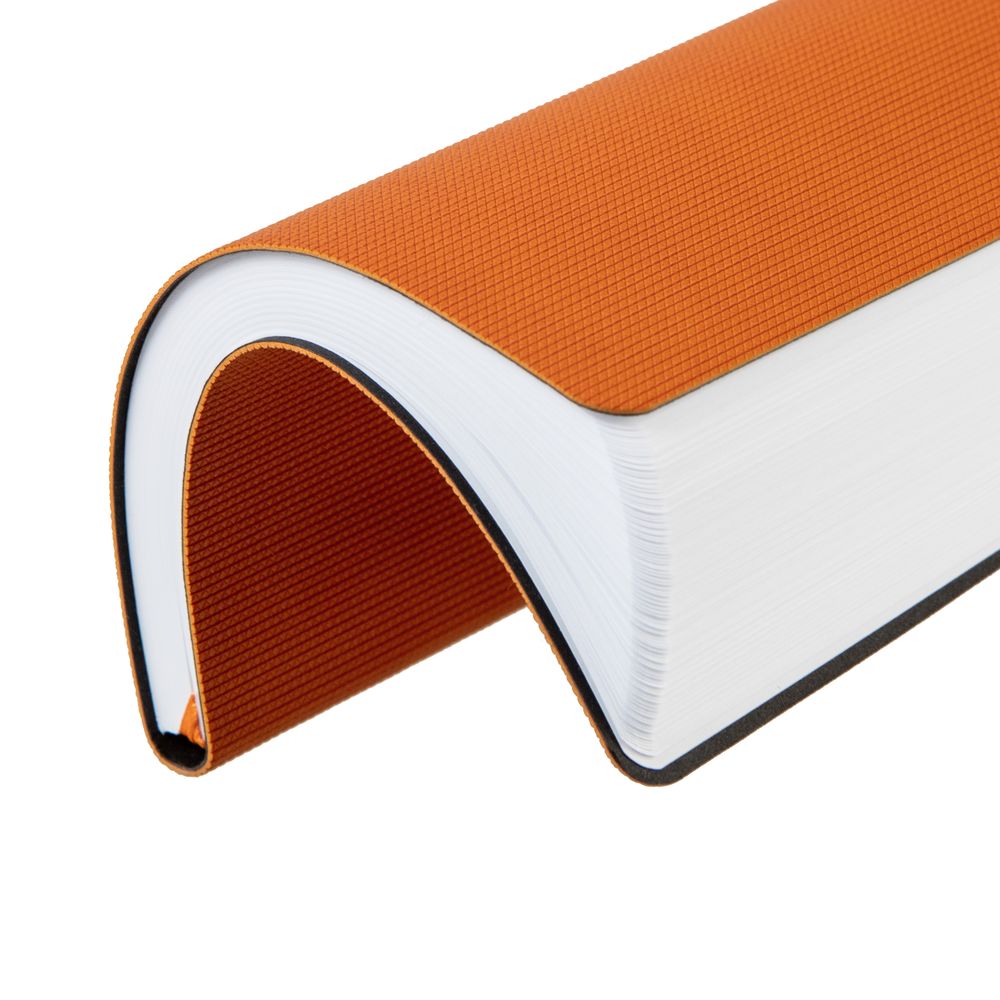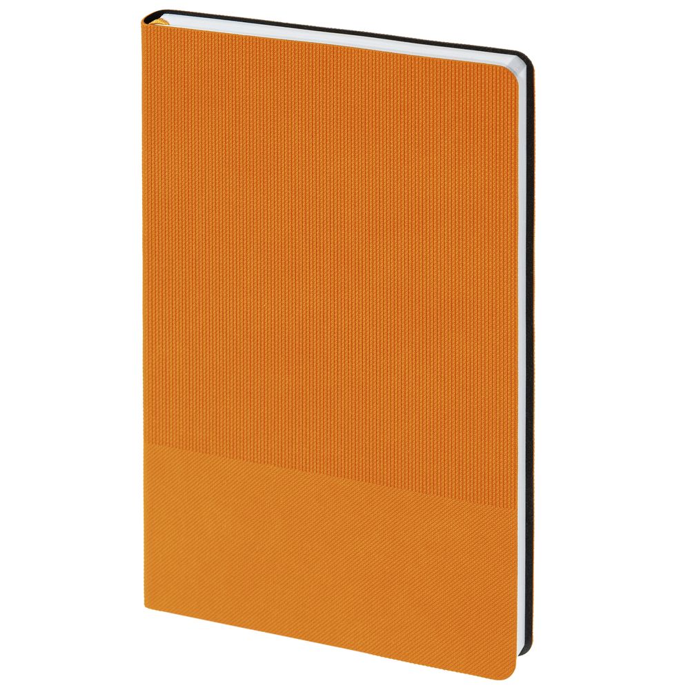 Ежедневник с гибкой обложкой, выполнен из материала Canyon, оранжевый ОО, дополнен ляссе в цвет обложки. Блинтовое тиснение на обложке создает эффект вязаного полотна.