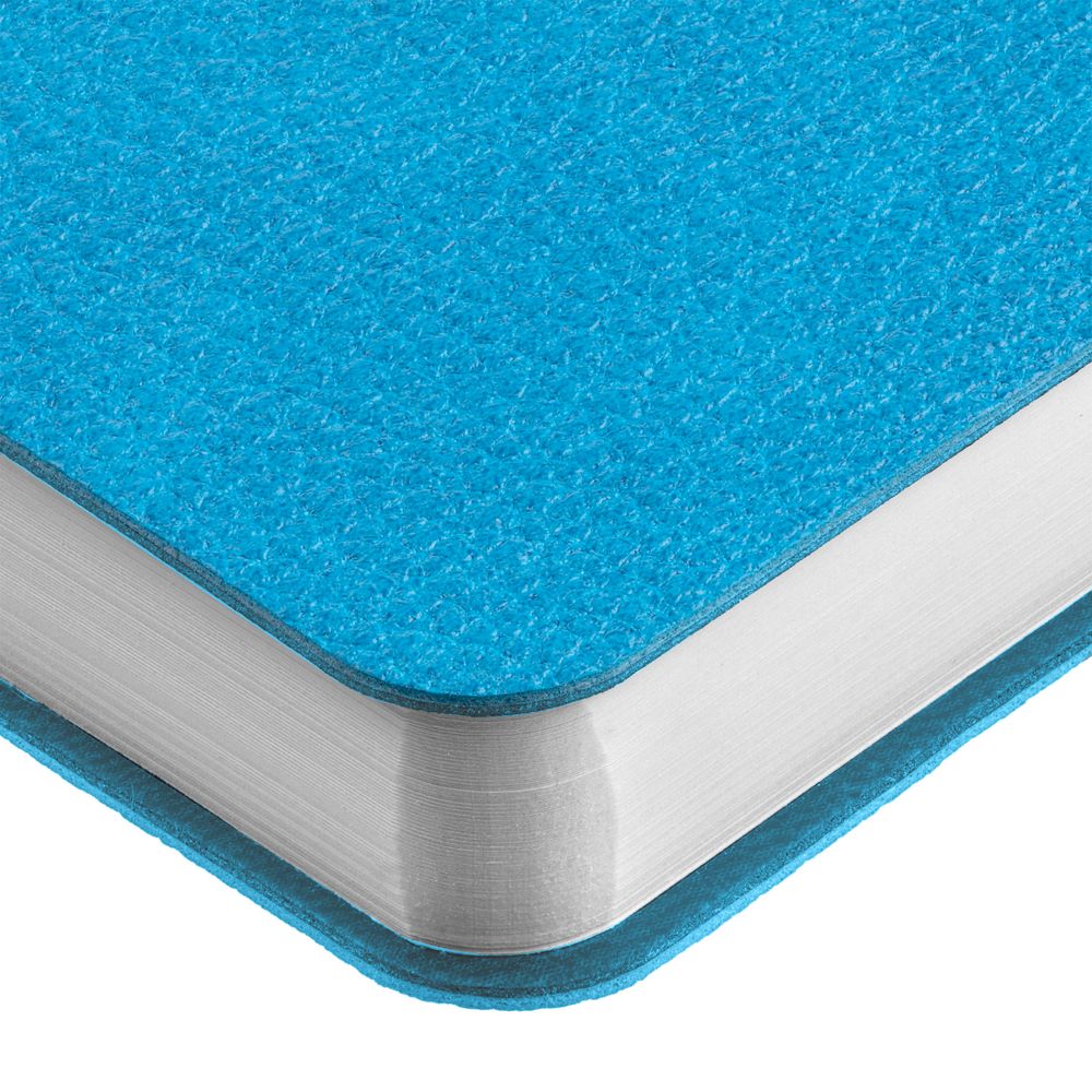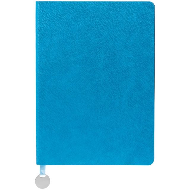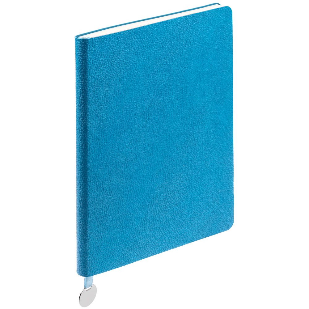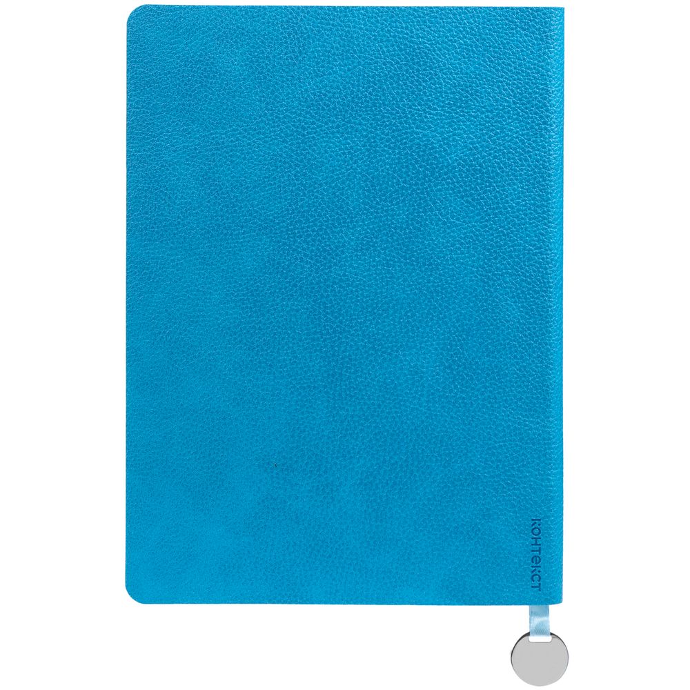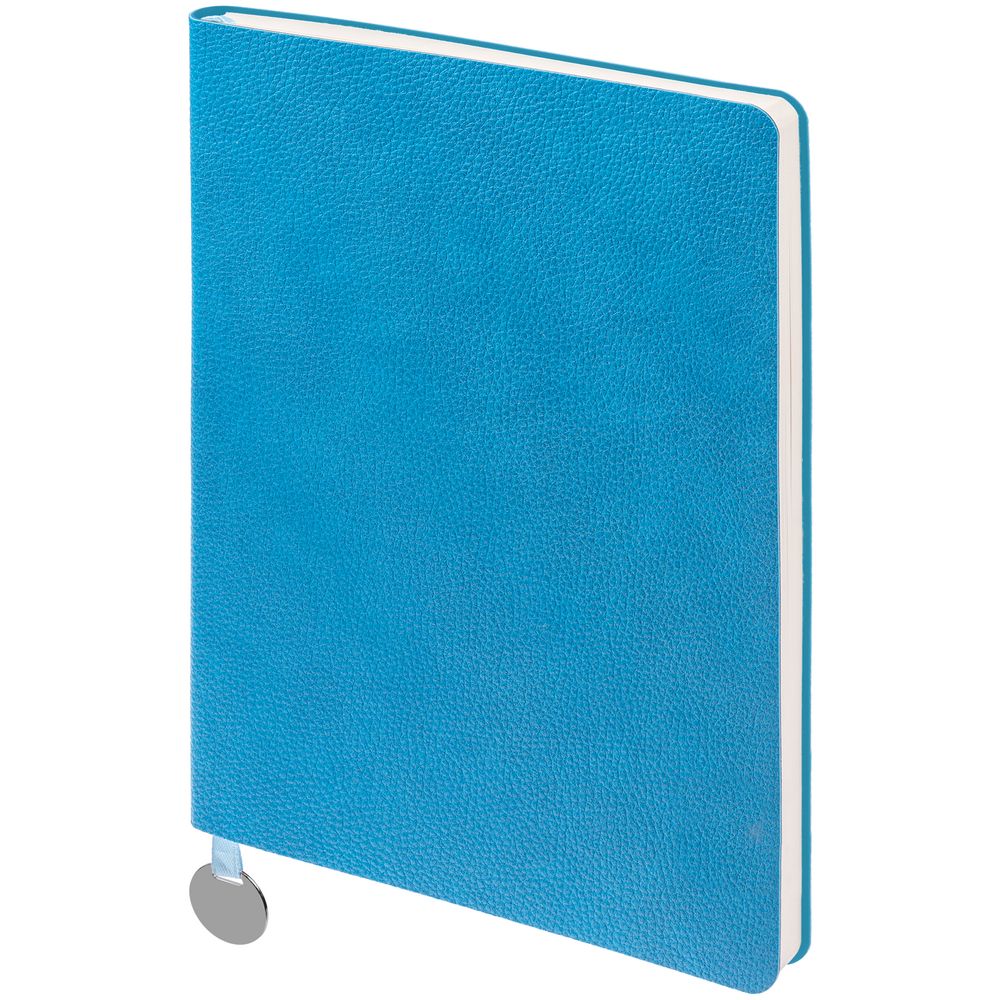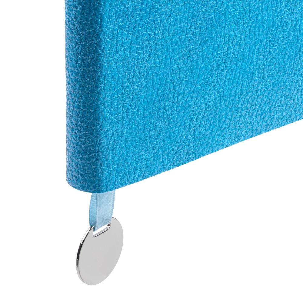 Ежедневник с гибкой обложкой, выполнен из материал La Fite, голубой JJ, дополнен ляссе в цвет обложки с металлическим шильдом.