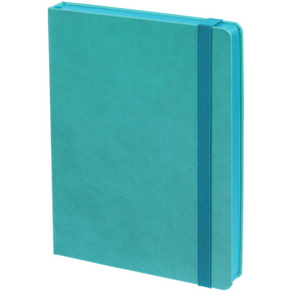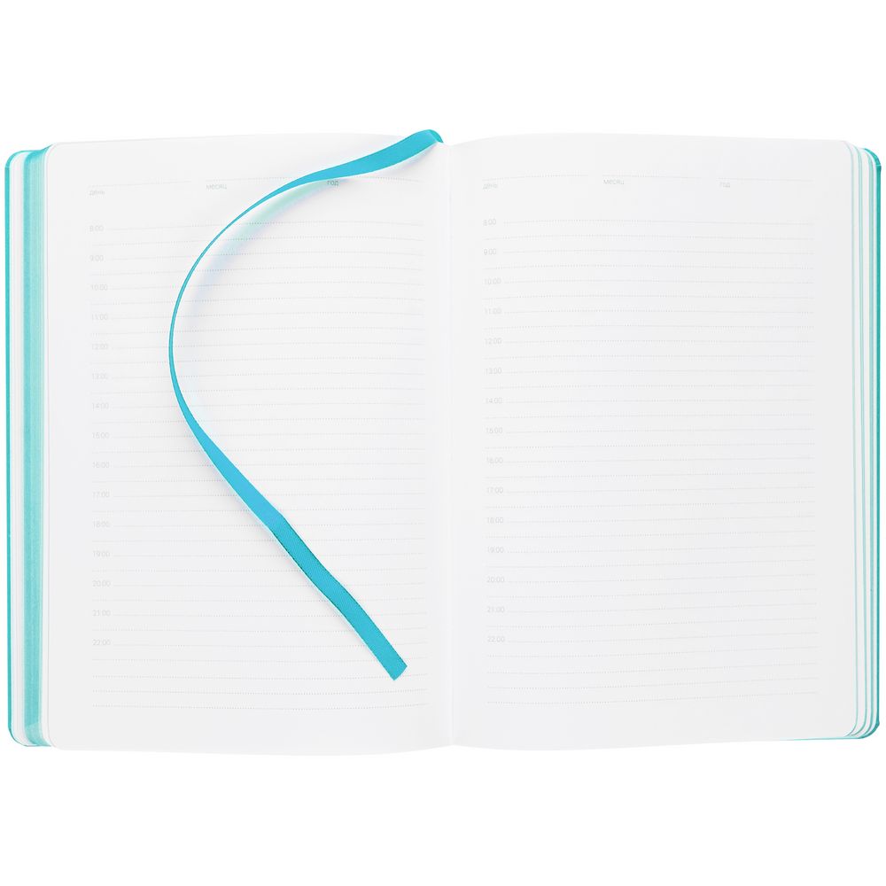 Ежедневник с твердой обложкой, выполнен из материала Latte, цвет морской волны II, обрез бирюзового цвета, дополнен резинкой и ляссе бирюзового цвета.