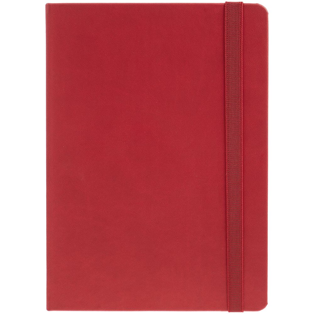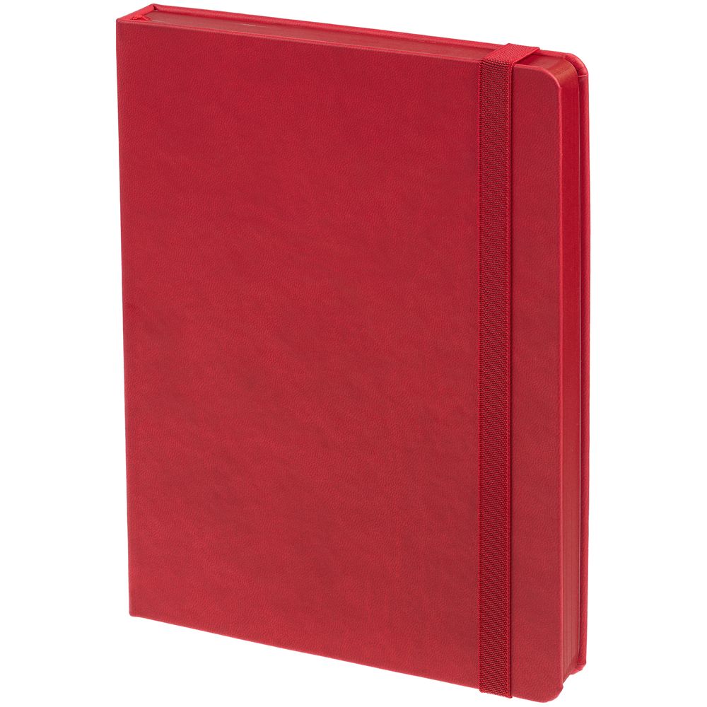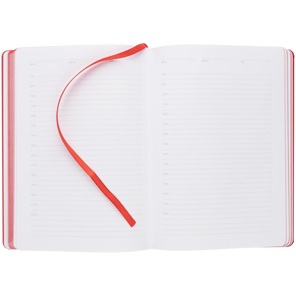 Ежедневник с твердой обложкой, выполнен из материала Latte, красный РР, обрез красного цвета, дополнен резинкой и ляссе красного цвета.