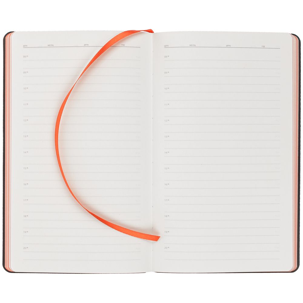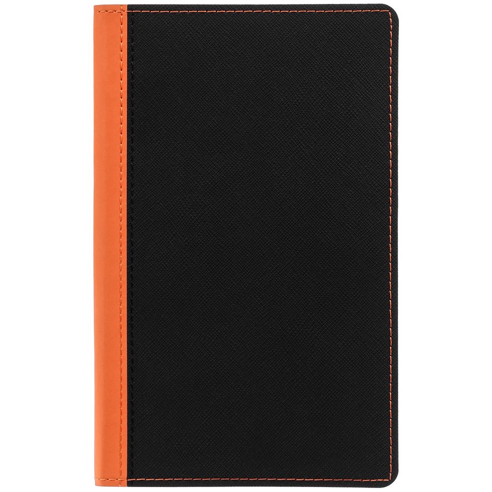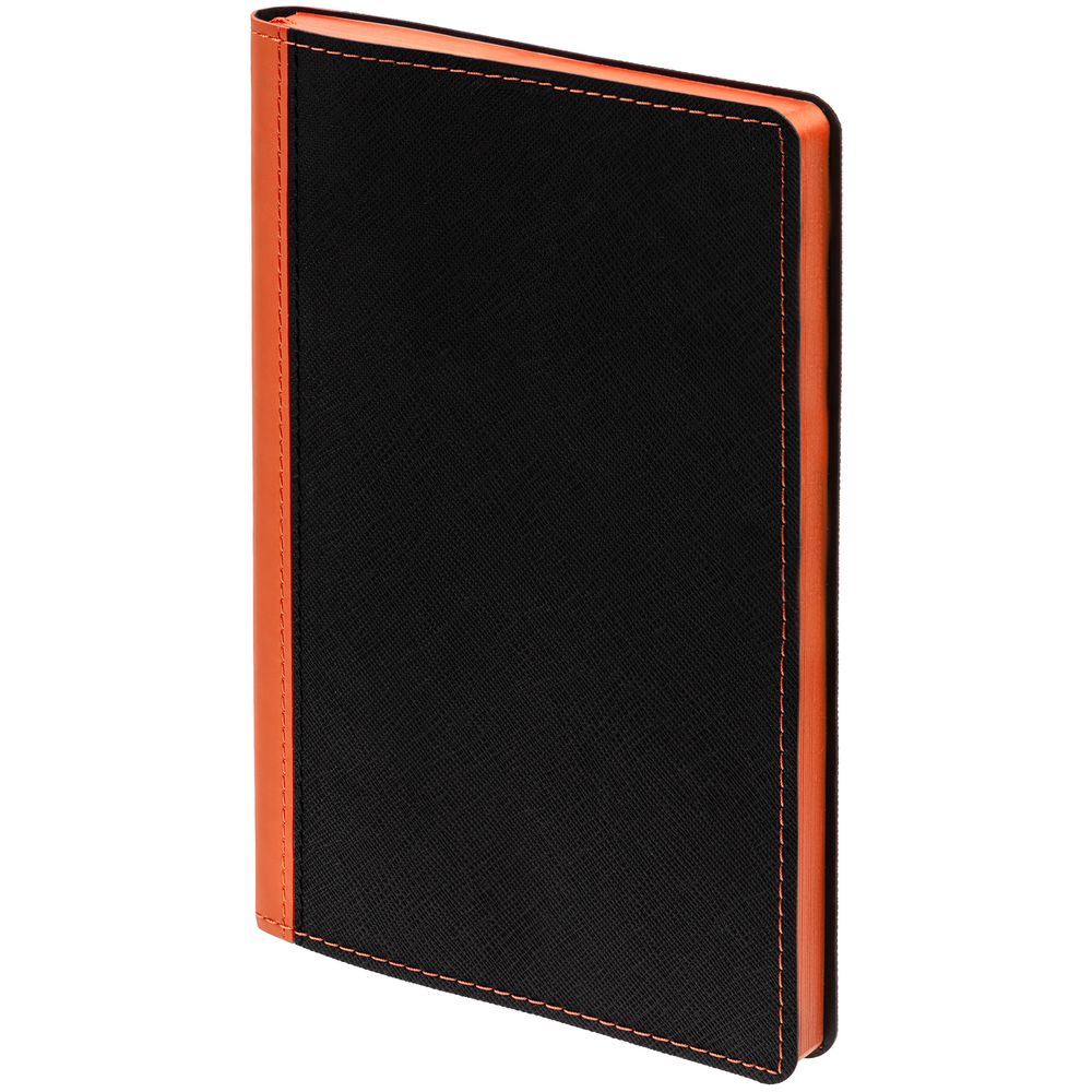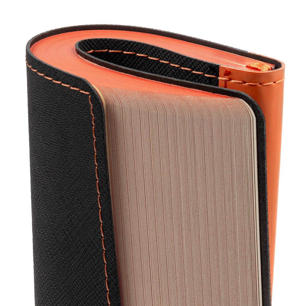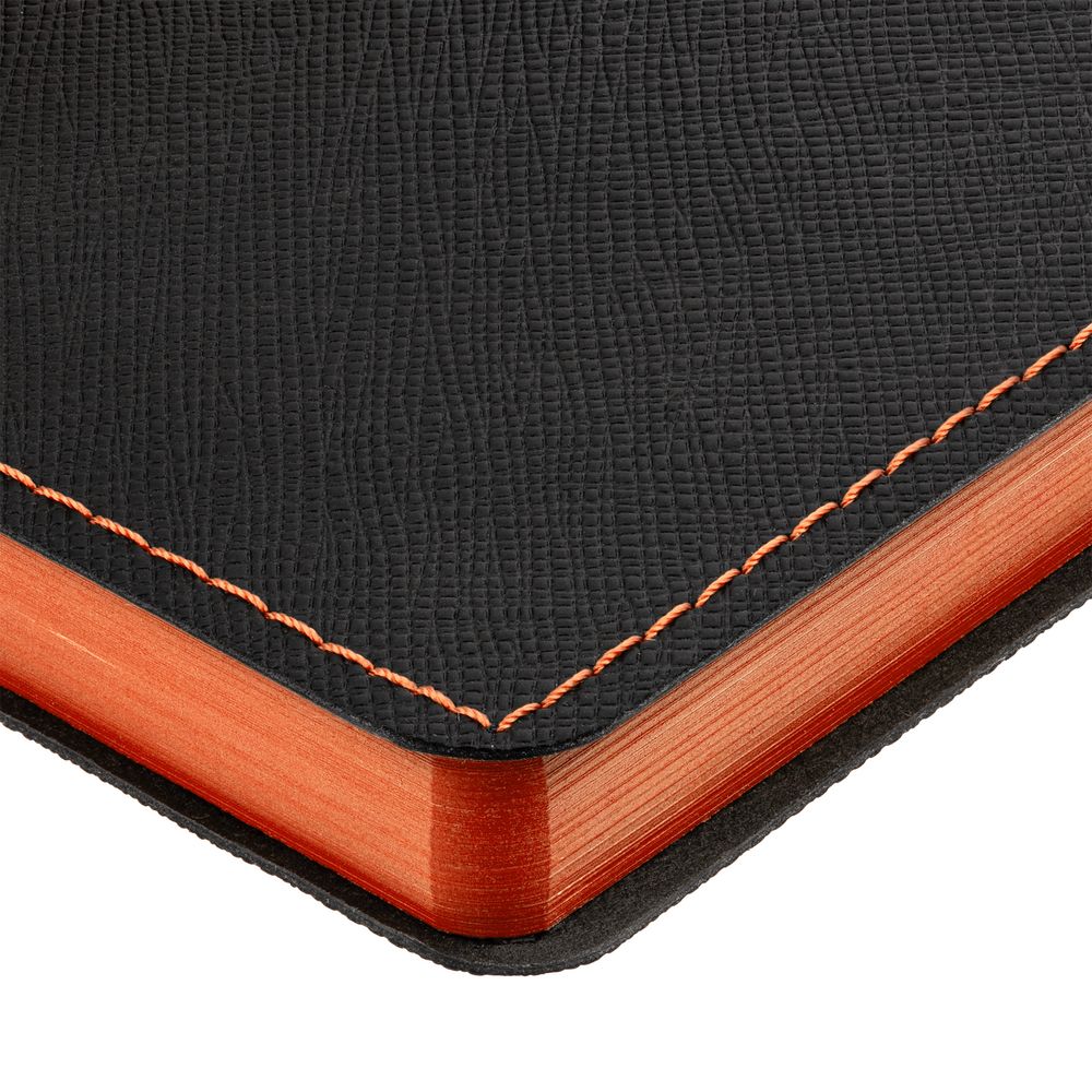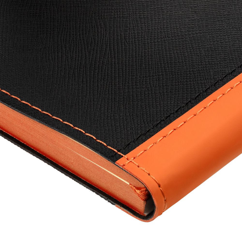 Ежедневник с гибкой обложкой выполнен из материала Nice Touch, черный АА и Soft Touch, оранжевый ОО, дополнен ляссе оранжевого цвета.