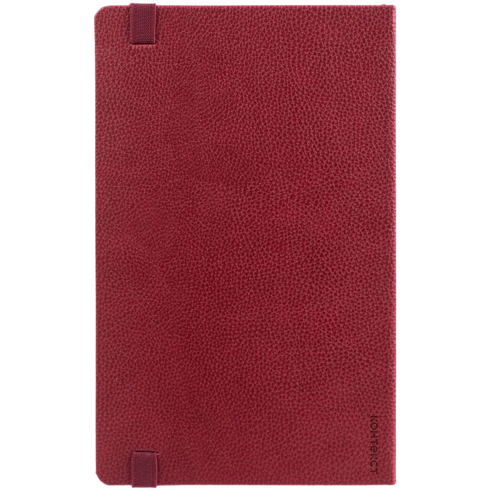 Ежедневник с твердой обложкой, выполнен из материала LaFite, красный РР, дополнен резинкой с металлическим прямоугольным шильдом и ляссе в цвет обложки.