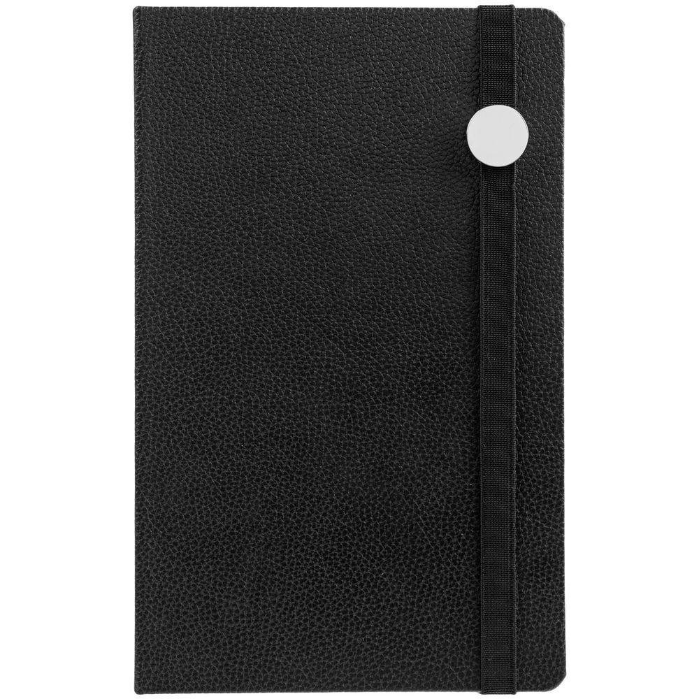 Ежедневник с твердой обложкой, выполнен из материала LaFite, черный АА, дополнен резинкой с металлическим круглым шильдом и ляссе в цвет обложки.