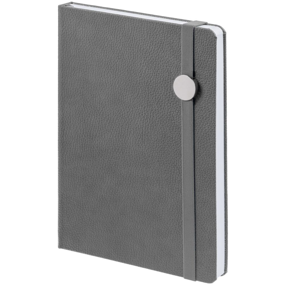 Ежедневник с твердой обложкой, выполнен из материала LaFite, серый СС, дополнен резинкой с металлическим круглым шильдом и ляссе в цвет обложки.