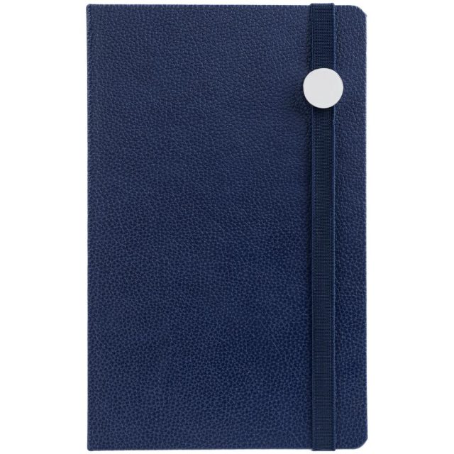 Зауженный ежедневник с круглым металлическим шильдом на резинке.