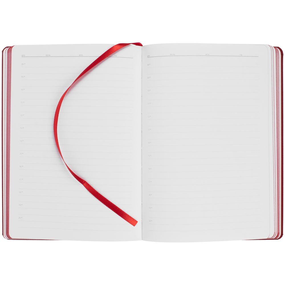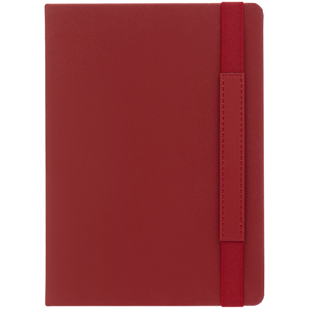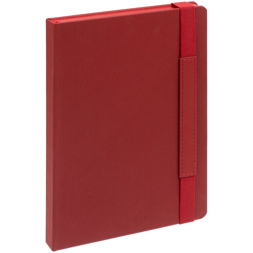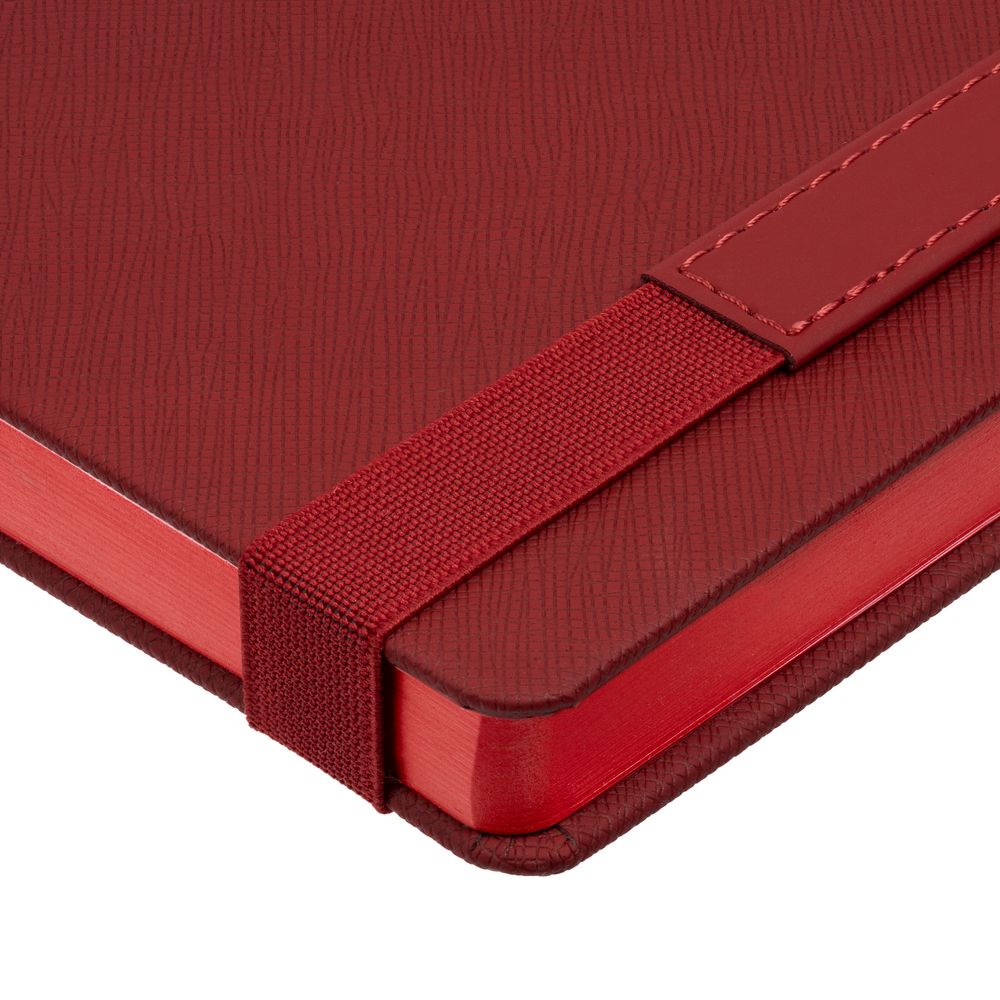 Ежедневник с твердой обложкой, выполнен из материала Nice Touch, красный РР, дополнен резинкой с лейблом из материала Soft Touch и ляссе в цвет обложки.