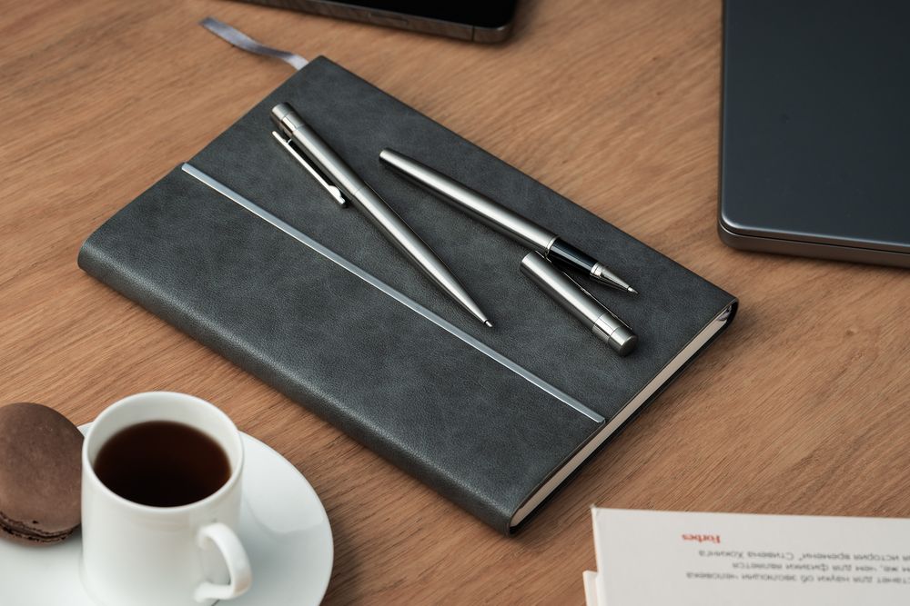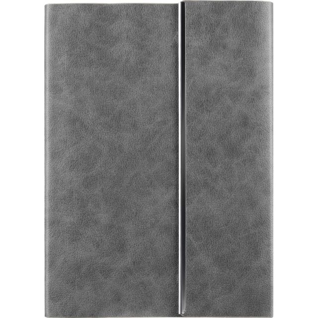Ежедневник с гибкой обложкой, клапаном на магните и металлической отделкой клапана. Выполнен из материала Petrus, серый СС, дополнен серым ляссе.
