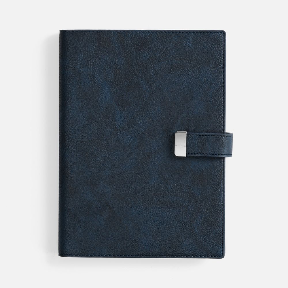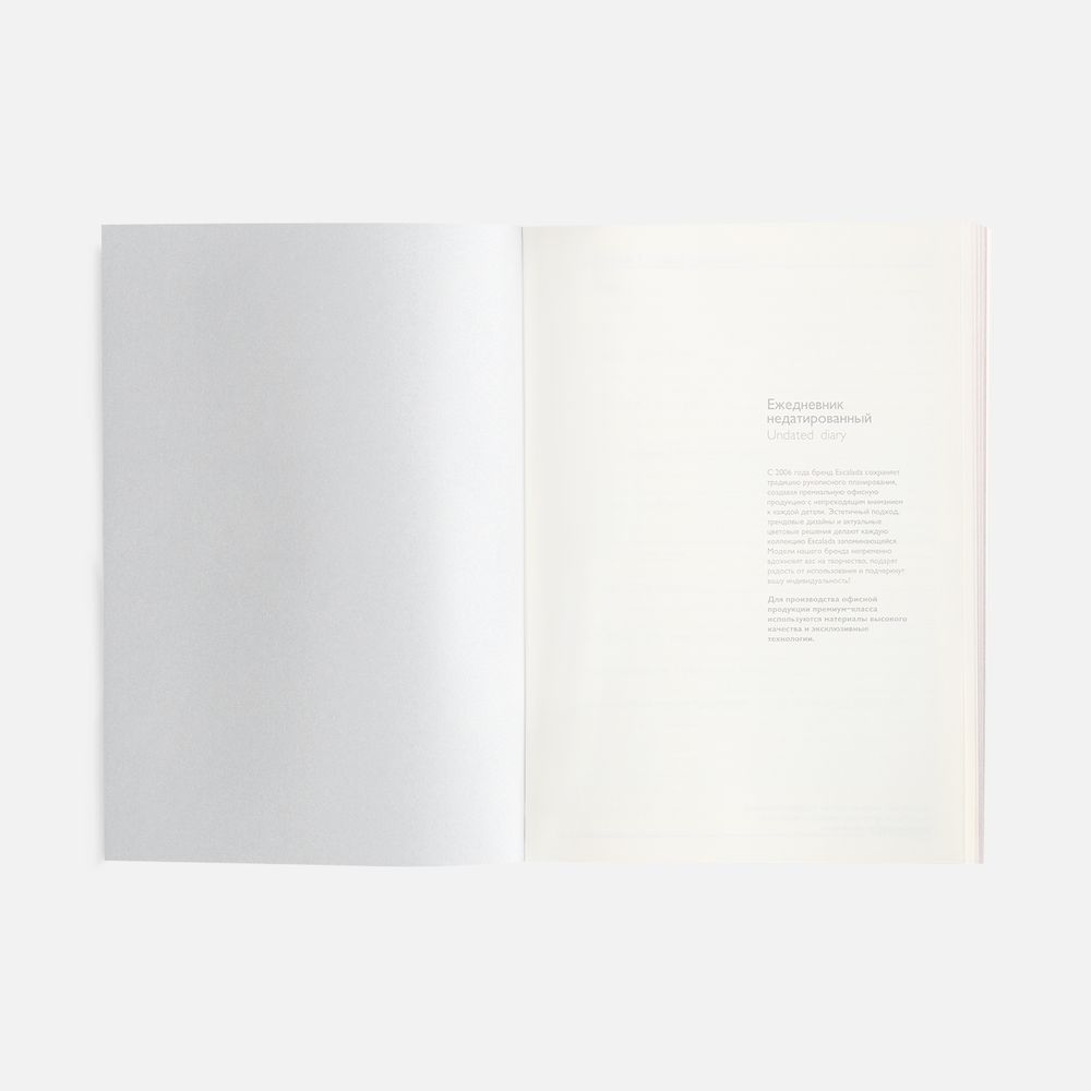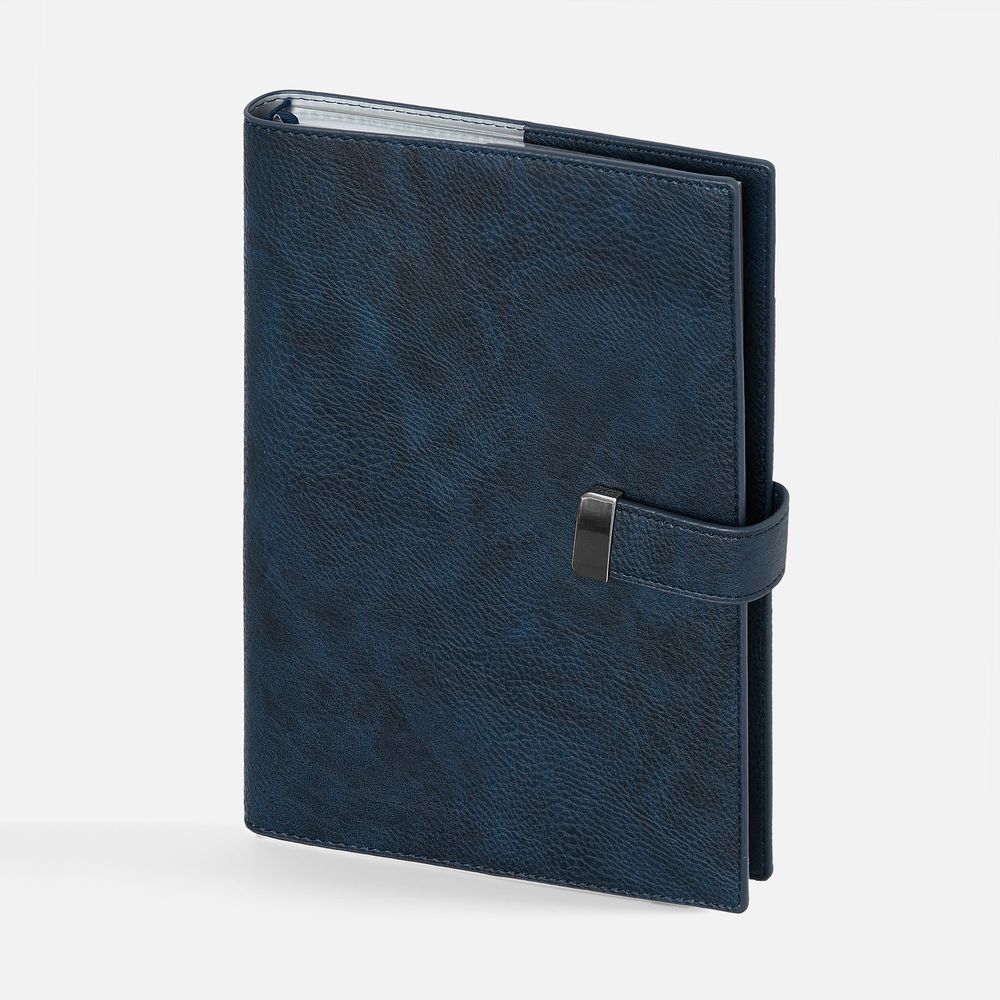 Ежедневник в мягком переплете со съемной обложкой, дополнен застежкой-хлястиком с металлическим шильдом на кнопке, двойным ляссе и капталом.