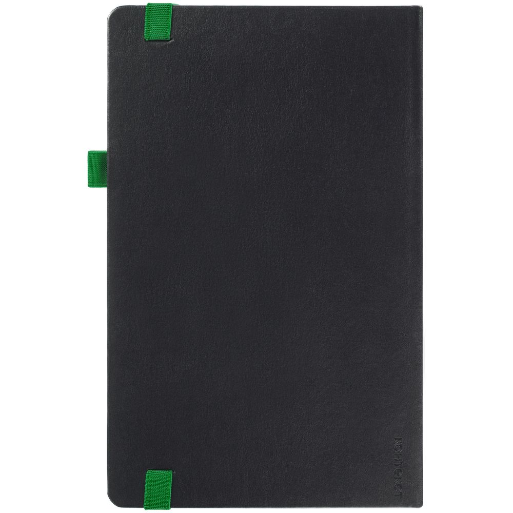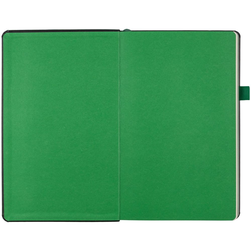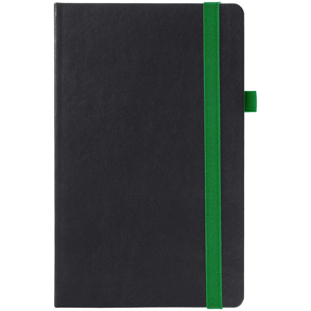 Ежедневник с твердой обложкой, выполнен из материала Waltz, черный АА, дополнен зеленой резинкой и ляссе.