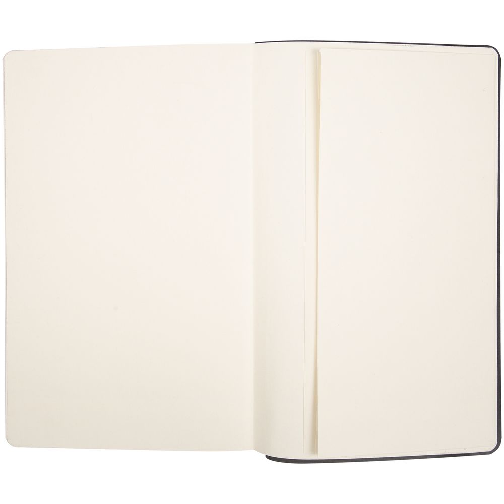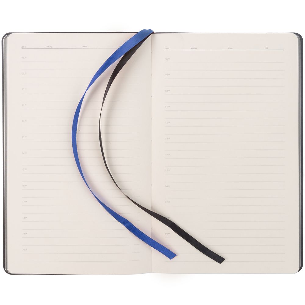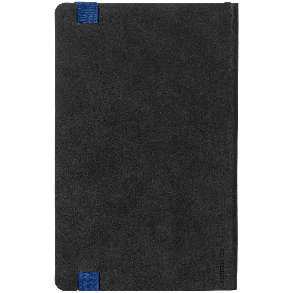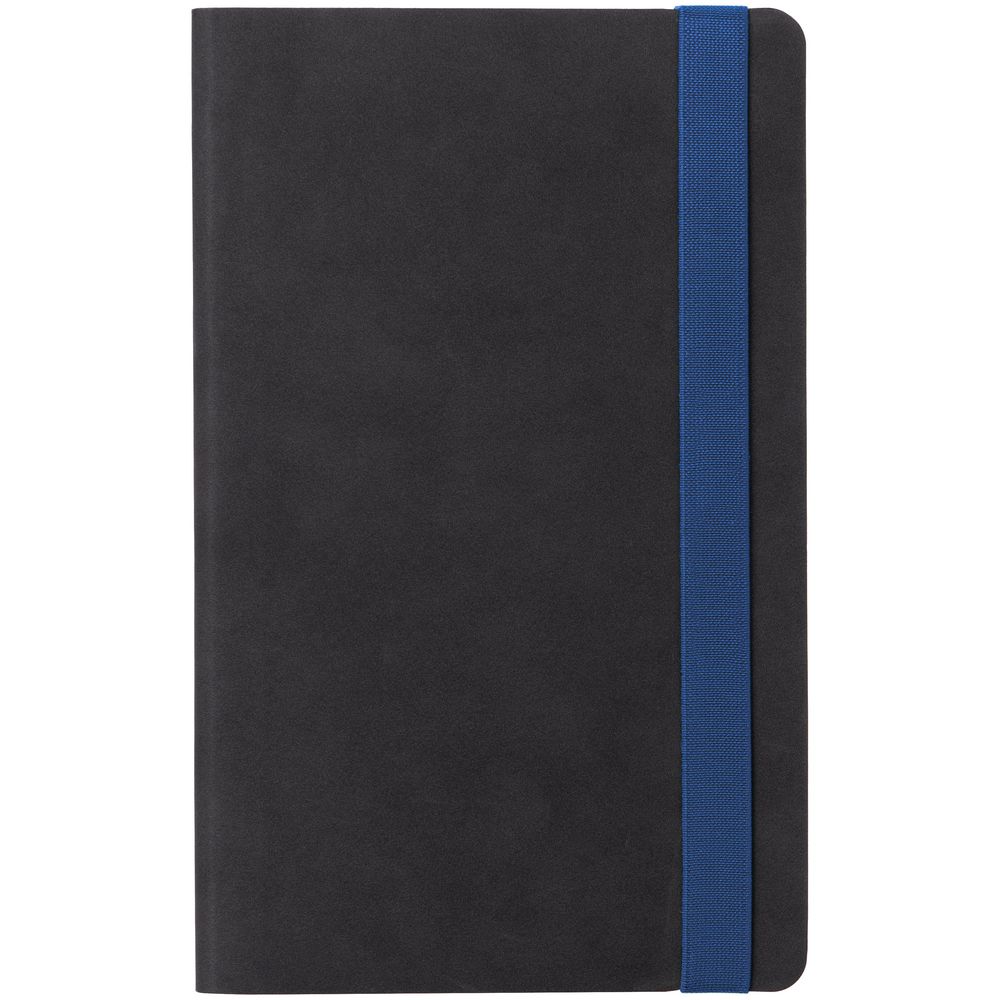 Зауженный ежедневник с гибкой обложкой, выполнен из материала Nubuck, черный АА, дополнен синей резинкой и двойным ляссе.