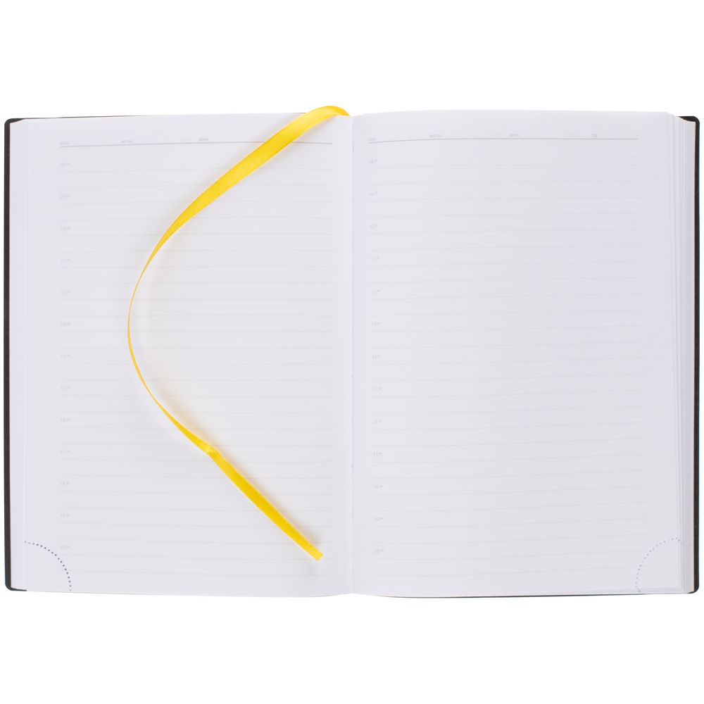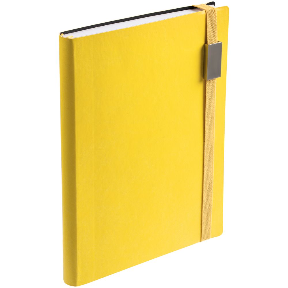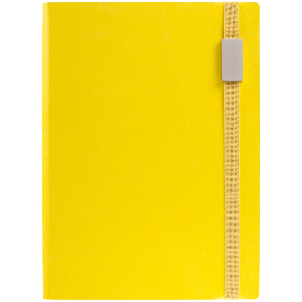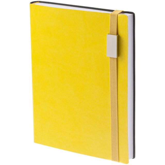 Ежедневник с гибкой обложкой выполнен из материала Latte, желтый КК, и дополнен резинкой шириной 1 см с металлическим шильдом, капталом и ляссе желтого цвета.