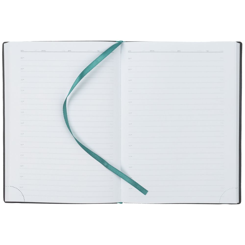 Ежедневник с гибкой обложкой выполнен из материала Brand, морская волна II, и дополнен резинкой шириной 1 см, капталом и ляссе в цвет обложки.