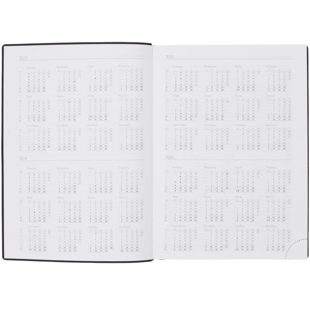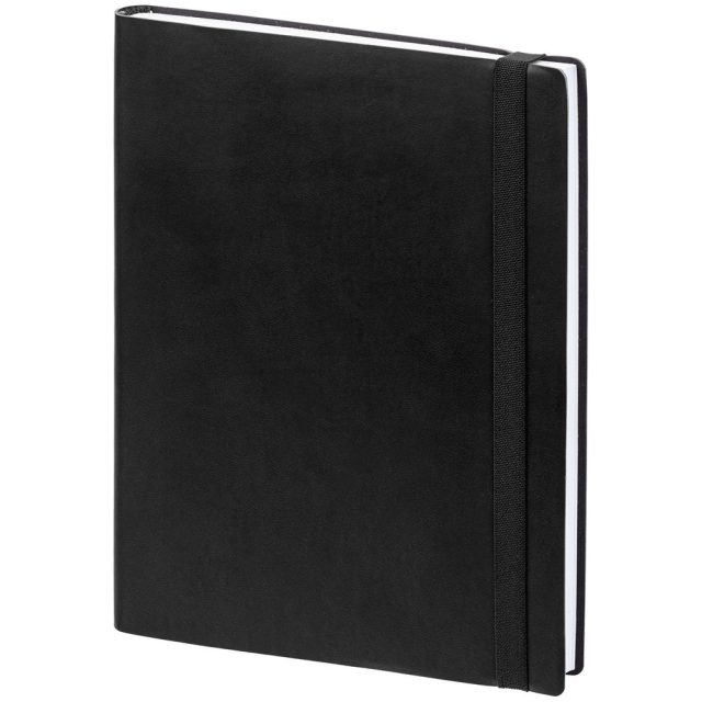 Ежедневник с гибкой обложкой выполнен из материала Latte, черный АА, и дополнен резинкой шириной 1 см, капталом и ляссе черного цвета.