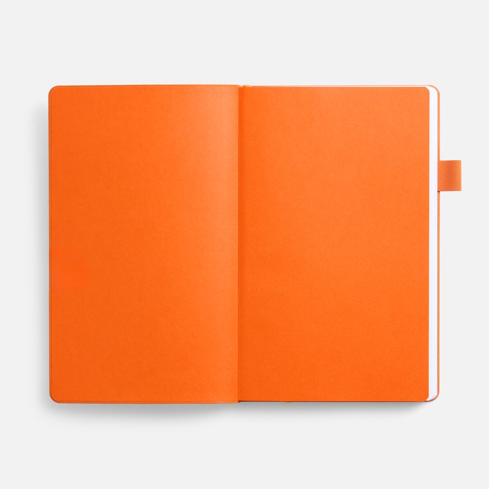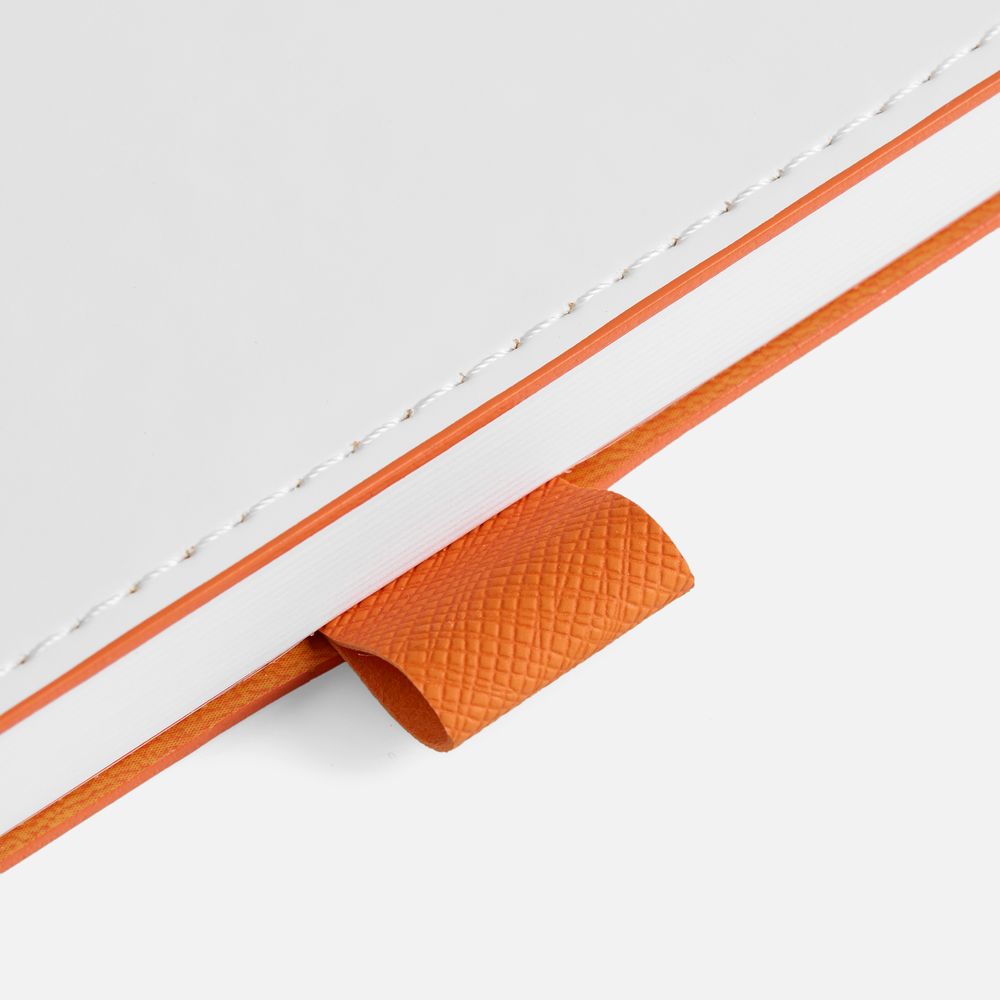Гибкая обложка, материал обложки — Soft Touch, белый BB и Latte, оранжевый ОО; материал петли для ручки — Nice Touch, оранжевый ОО. Срез обложки окрашен в оранжевый цвет.