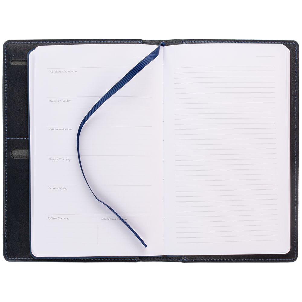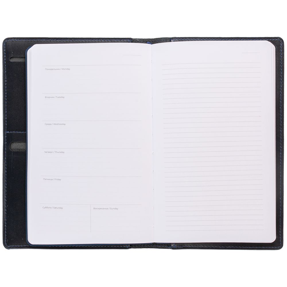 Еженедельник Remini со съемной обложкой-портфолио из натуральной кожи, репсовым ляссе и окрашенным срезом обложки в цвет материала.