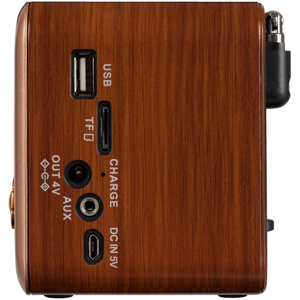 За корпусом, всем своим видом отсылающим к актуальному стилю мидсенчури, скрываются вполне современные функции: возможность воспроизведения музыки по Bluetooth и с карт памяти различного формата.