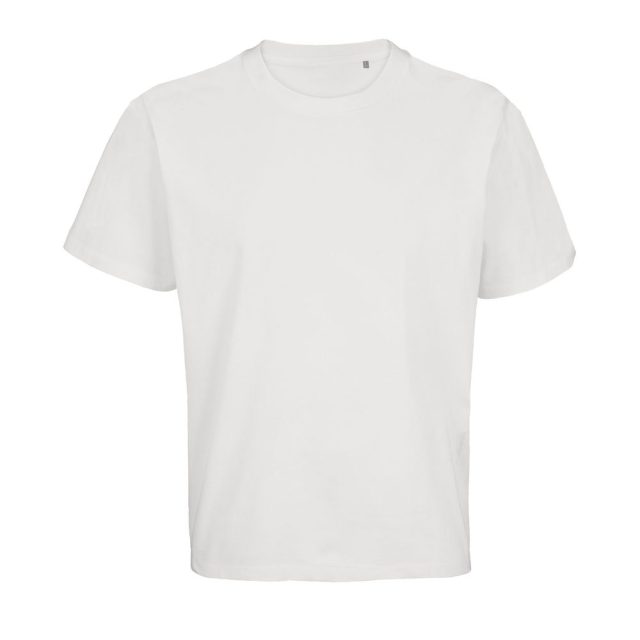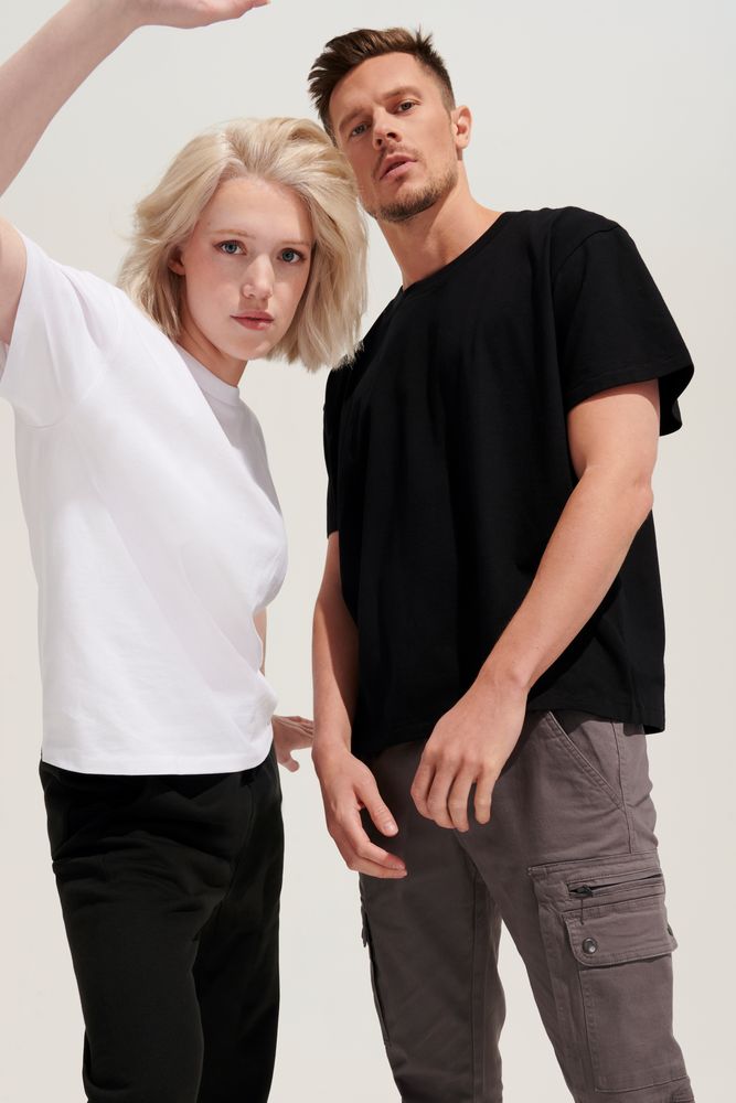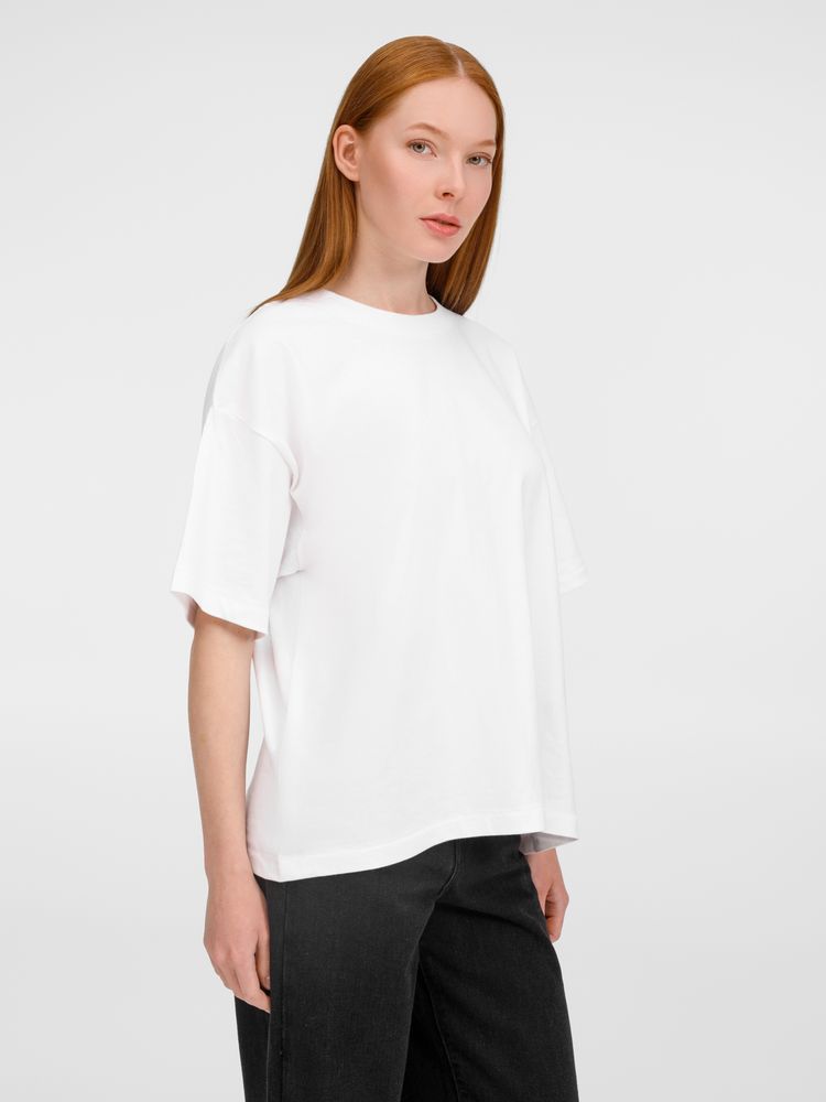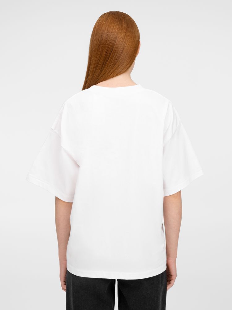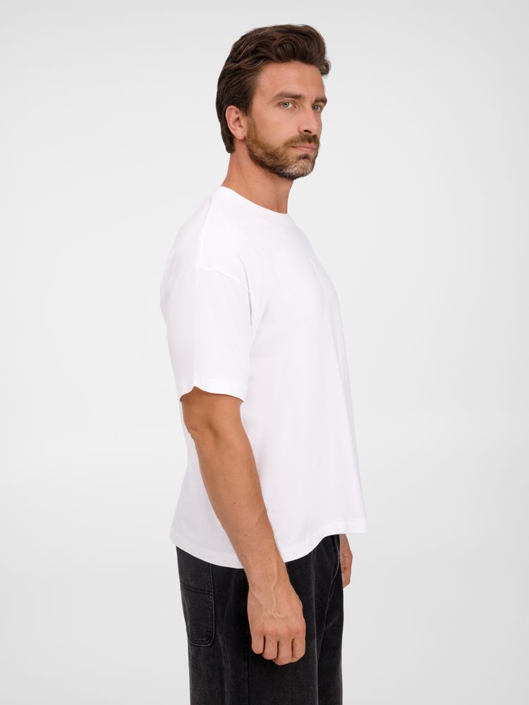 Футболка оверсайз унисекс с круглым вырезом и без боковых швов. Выполнена из смеси переработанного и обычного хлопка. Благодаря повышенной плотности отлично держит форму.