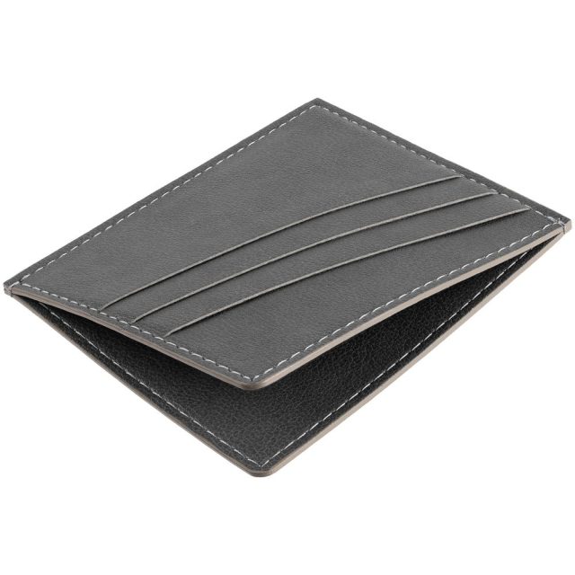 Чехол выполнен из материала Petrus, серый СС, дополнен окрашенным срезом края и внутренним карманом из серого картона. Имеет 4 отделения для кредитных карт и 1 отделение для купюр.