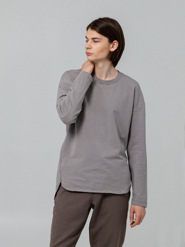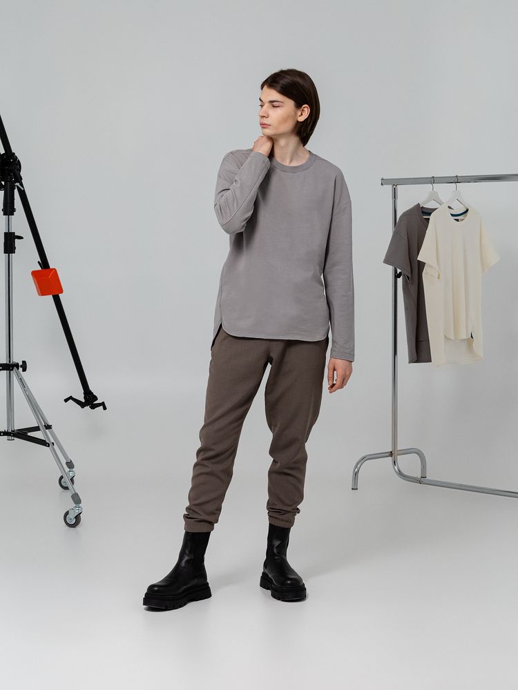Футболка унисекс с длинным рукавом свободного кроя со спущенным плечом и смещенными плечевыми и боковыми швами.