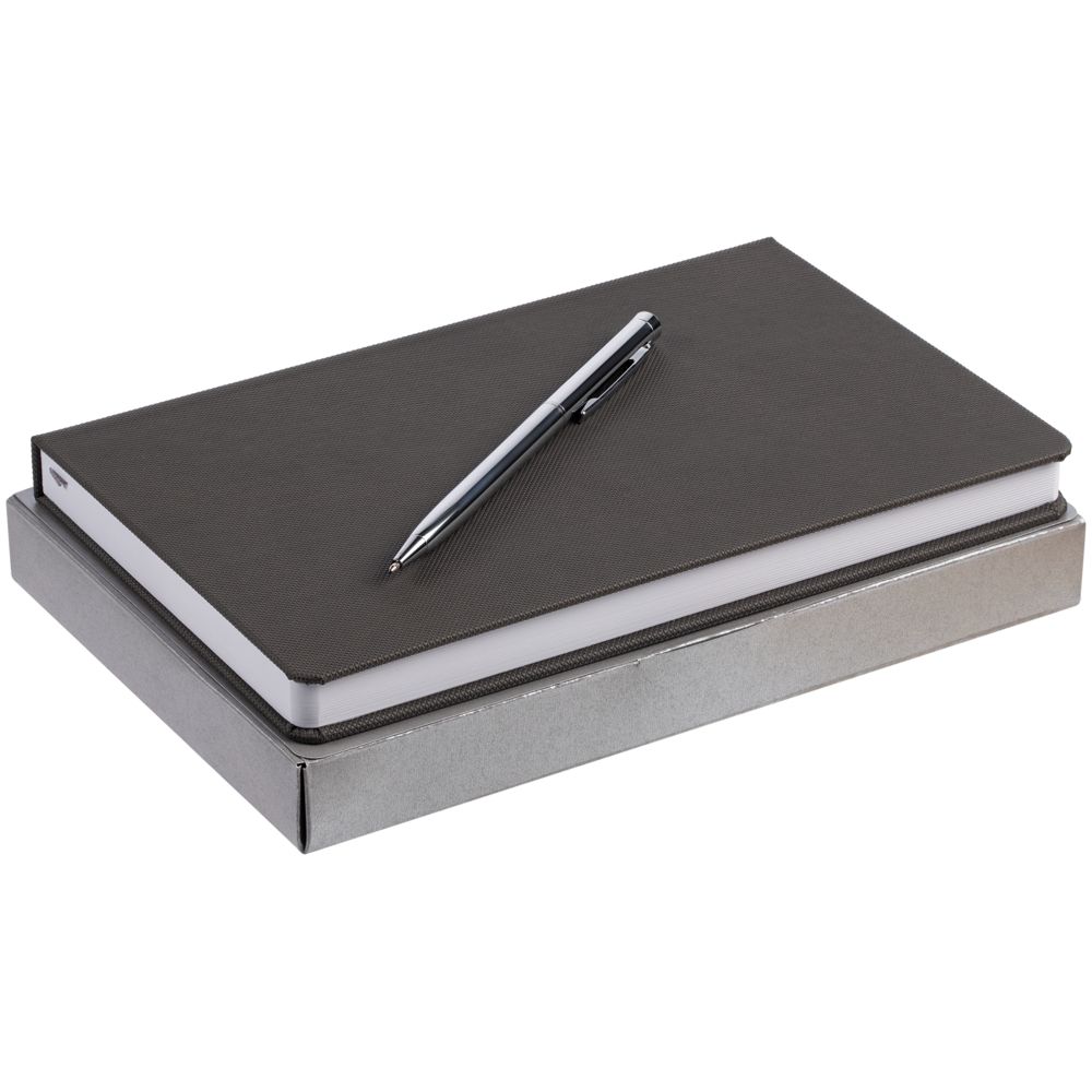 ежедневник — искусственная кожа; ручка — металл; коробка — бумага