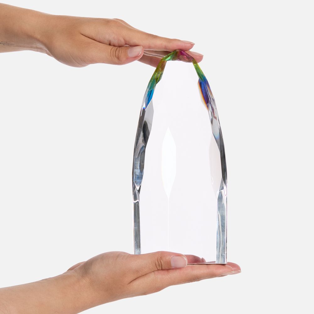 Объемная высокая стела Gleampeak олицетворяет стремление к победам и блестящий успех, свет от которого будет еще долго разливаться вокруг. Необычная форма с легкой огранкой и плавно скошенными краями усиливает визуальный эффект и создает притягательные отблески по всей стеле — она словно светится изнутри! Такое разноцветное свечение — яркий символ творческого подхода, который окрасит в разные оттенки любое дело.