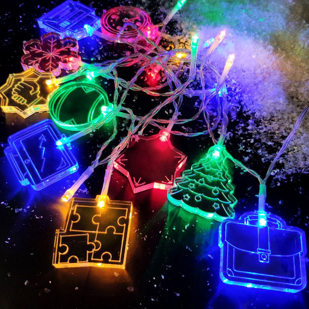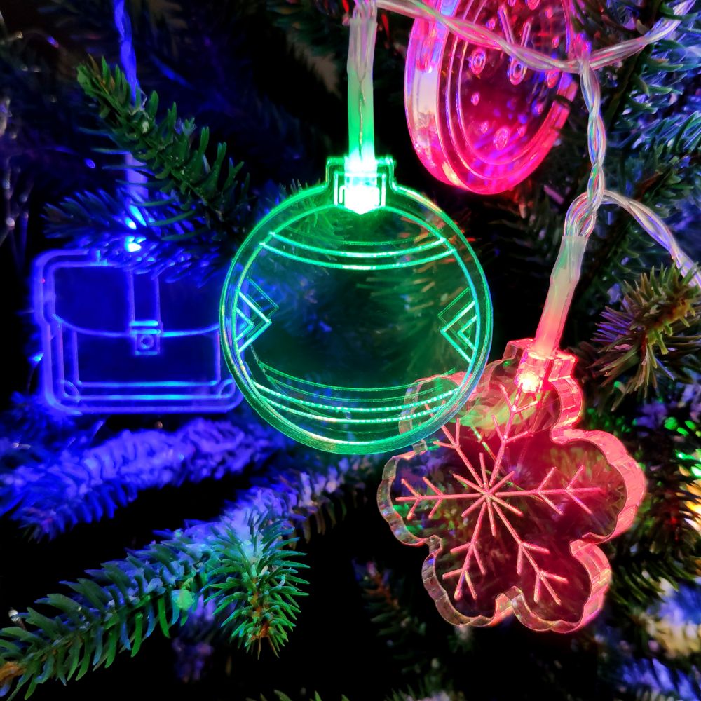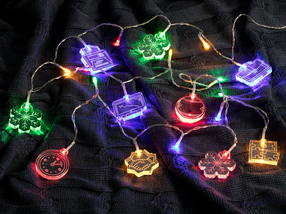 Гирлянда состоит из 20 разноцветных светодиодов и 10 акриловых фигурок.