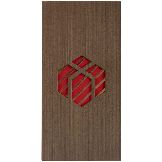 Под сдержанной обложкой из шпона венге скрывается настоящая праздничная феерия — яркая дизайнерская бумага, тисненая фольгой.