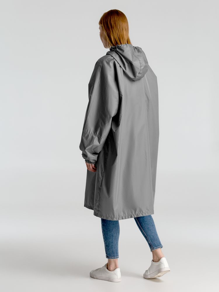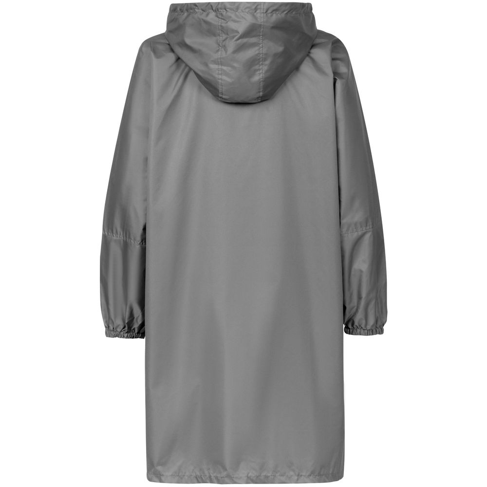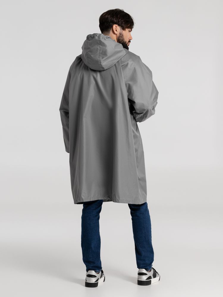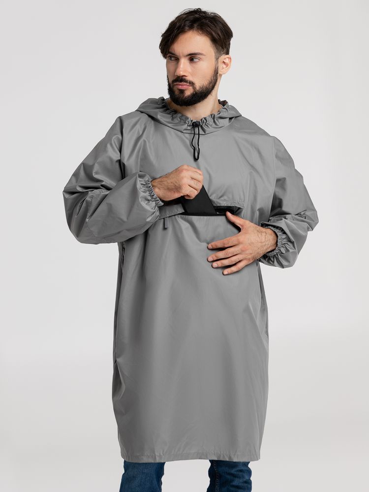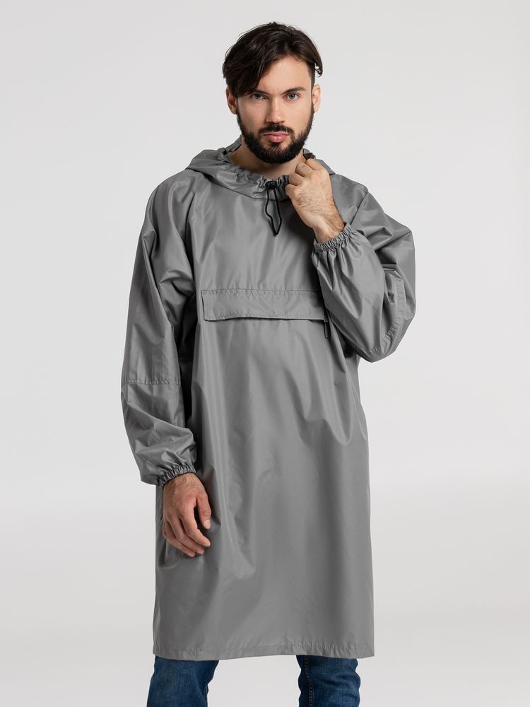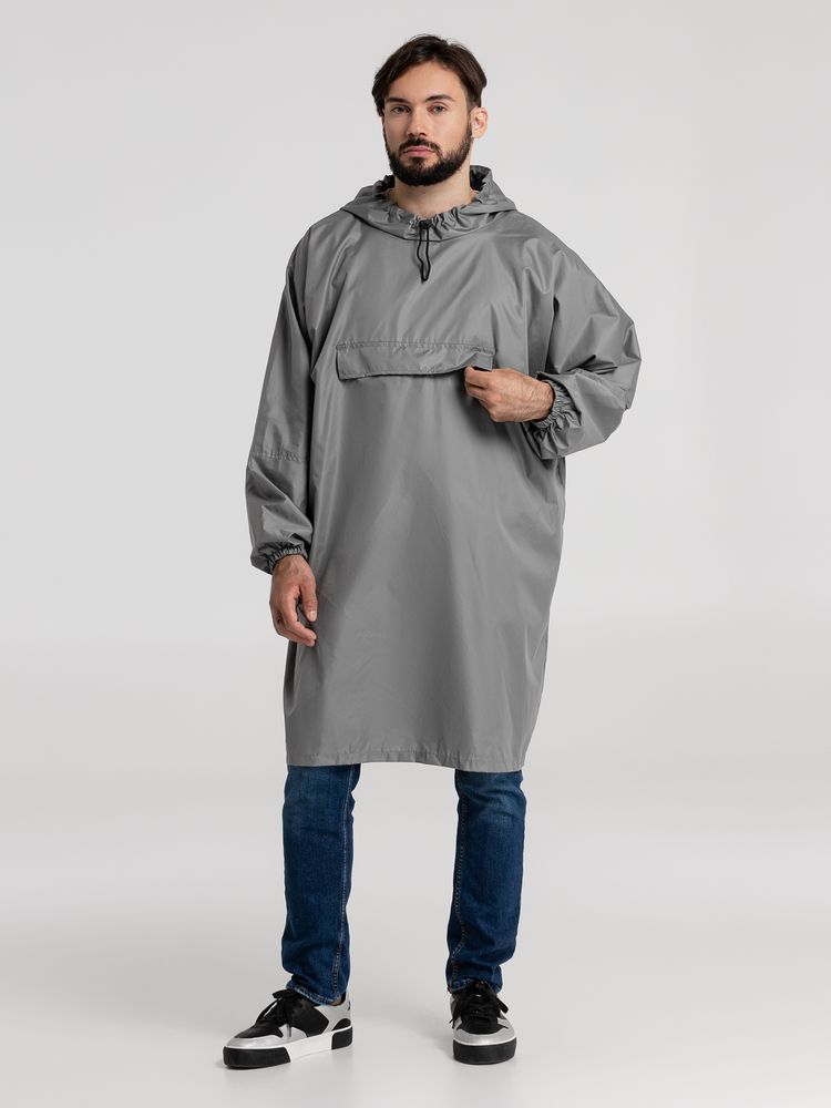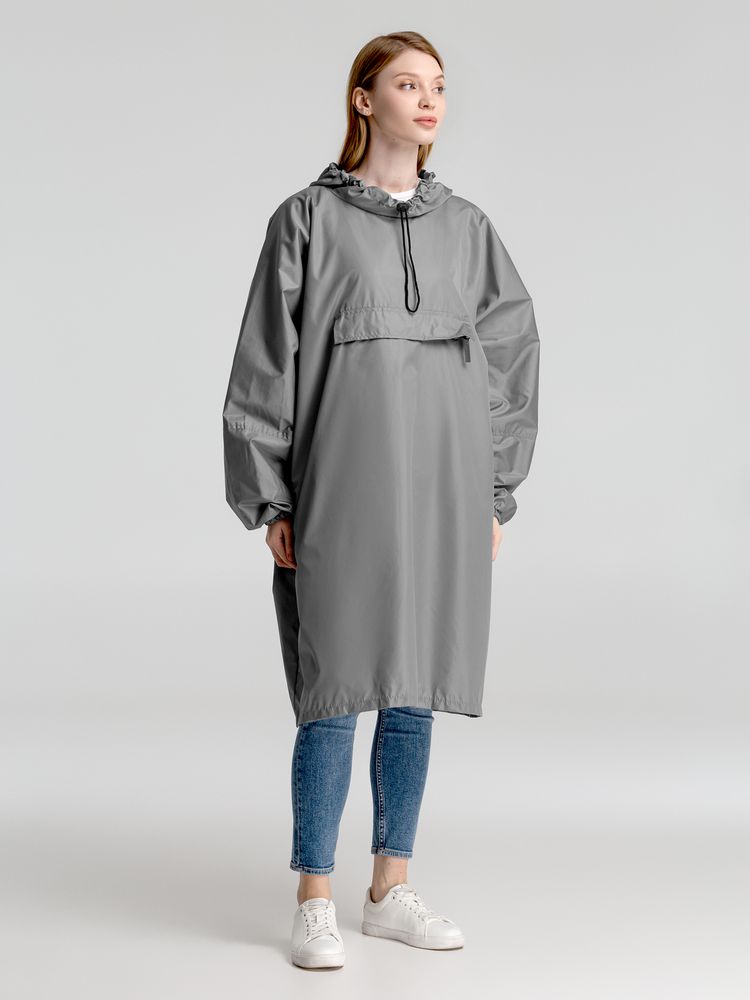 Дождевик-анорак с капюшоном и карманом на молнии спереди. Выполнен из ткани дюспо с матовой поверхностью — легкой, мягкой на ощупь, но устойчивой к повреждениям. Она не шелестит и практически не мнется. Благодаря пропитке дюспо обладает отличными водоотталкивающими и ветрозащитными свойствами.