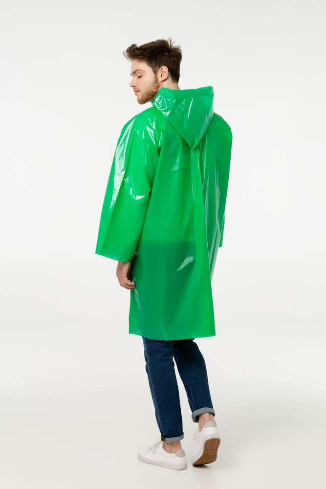 Дождевик-плащ с капюшоном и длинным рукавом из плотного полиэтилена высокого давления (ПВД).