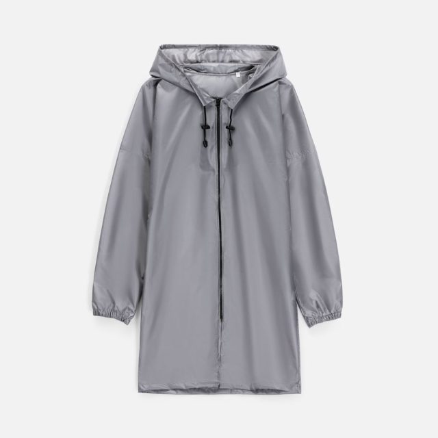 Плащ-дождевик из ткани таффета на молнии с капюшоном. Складывается в мешочек — удобно брать с собой.