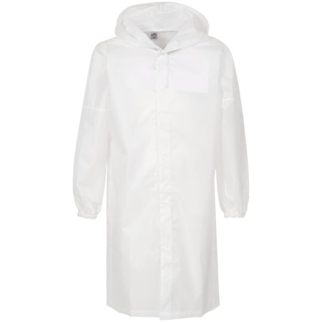 Плащ-дождевик из ткани таффета на кнопках с капюшоном.