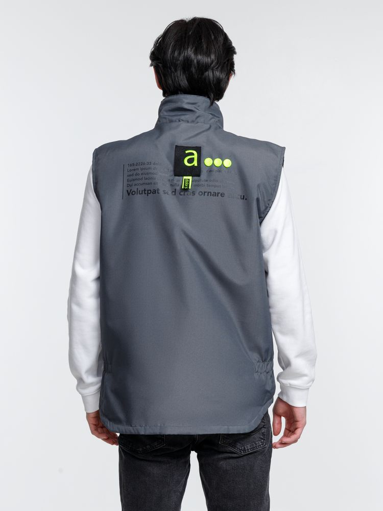 Мужской утепленный жилет с воротником-стойкой и удлиненной спинкой. Выполнен из ткани оксфорд с водоотталкивающим покрытием.