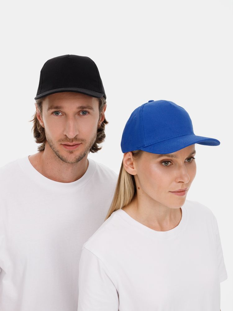 Модель бейсболки с 5-ю клиньями без лобового шва из плотного чесаного хлопка.