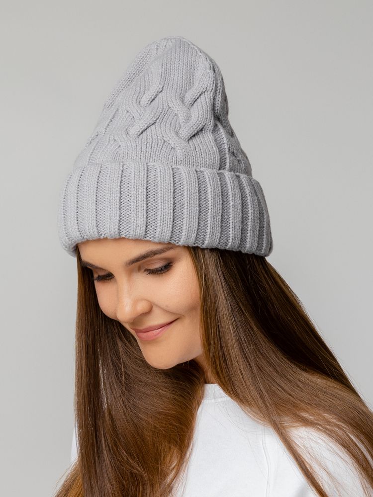 Мягкая удлиненная женская шапка объемной вязки Loren — уютный вариант для создания современного городского образа.