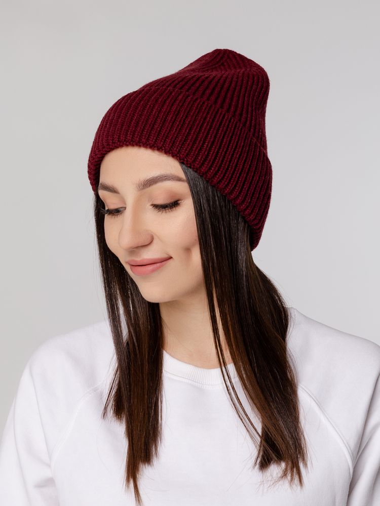 Шапка-бини из полушерстяной пряжи актуальных приглушенных оттенков. Трендовый фасон с удлиненным верхом — для расслабленного повседневного образа.