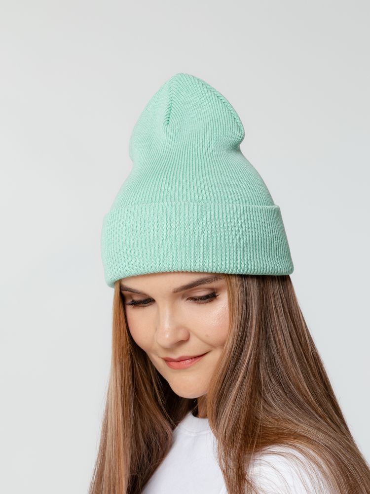 Двухслойная шапка, связанная резинкой, с широким отворотом.