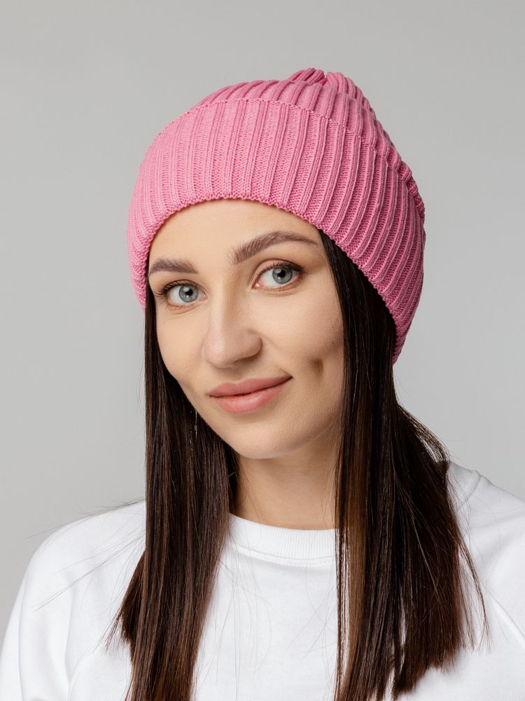 Однослойная шапка фактурной вязки с двойным отворотом.