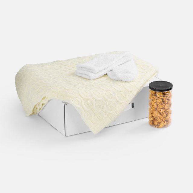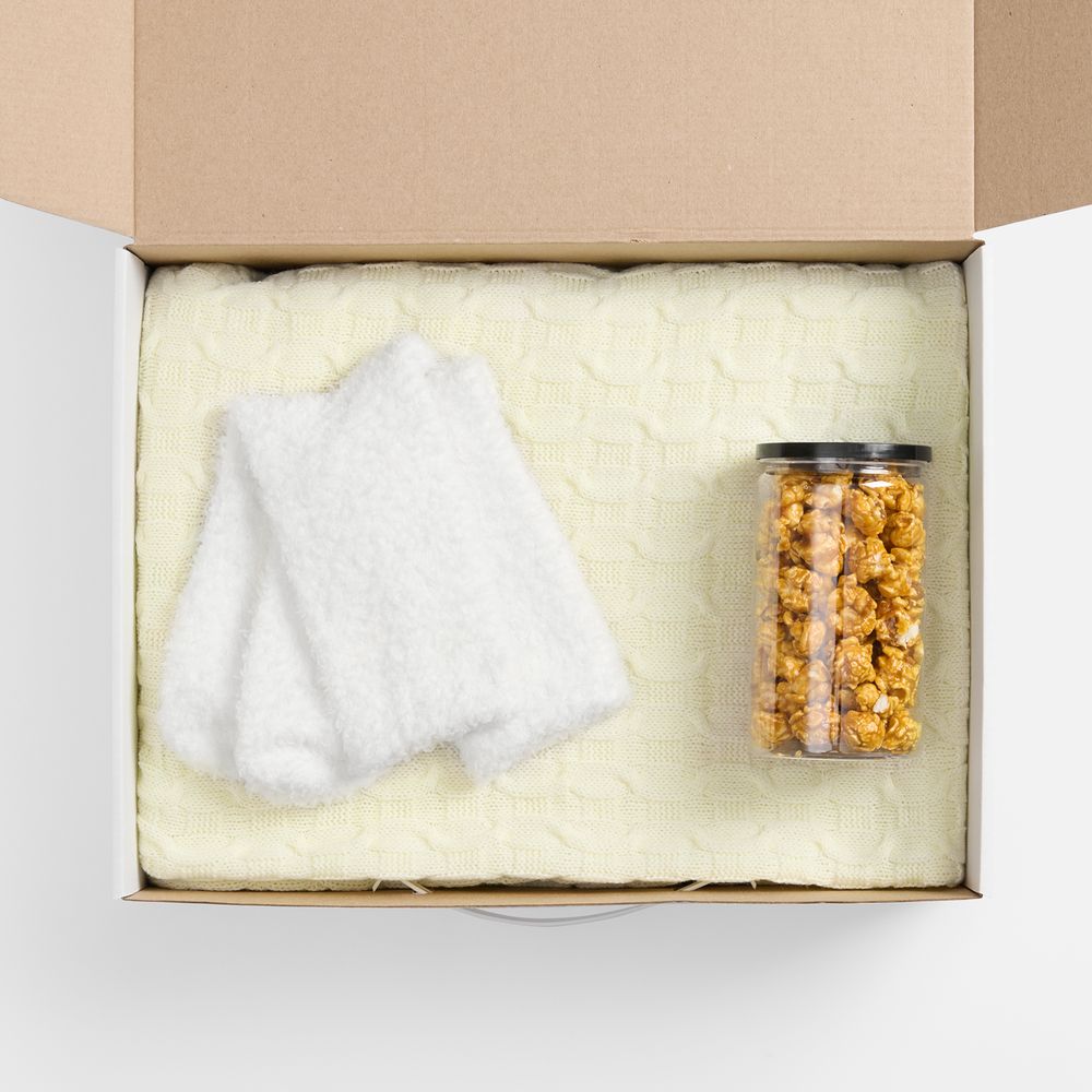 Нотка хрустящего удовольствия в сладком попкорне, обволакивающее тепло пледа с геометрическим узором и мягких пушистых носков — идеальное комбо для уютного вечера и великолепного времяпрепровождения.